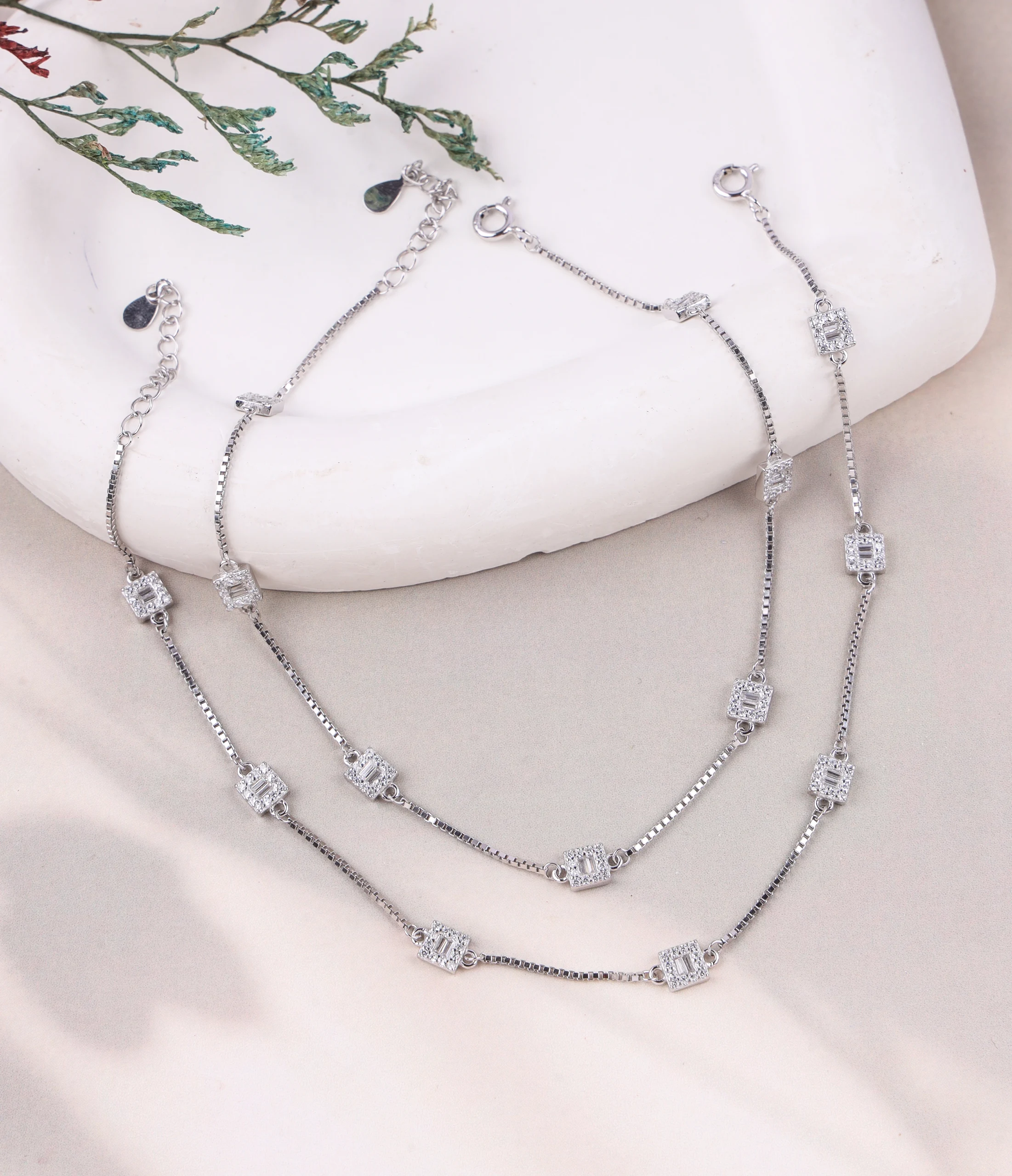 Adorn your ankle with the sophisticated sparkle of our Regal Radiance Silver Anklet. This exquisite piece is meticulously crafted from premium 925 sterling silver, ensuring both lasting quality and a brilliant shine. The delicate yet sturdy chain is elegantly punctuated with rectangular, baguette-cut cubic zirconia stones, set in a dazzling pavé style within a geometric silver frame. These striking accents are beautifully interspersed with smaller, round-cut cubic zirconia details, creating a continuous play of light and an illusion of intricate craftsmanship. This anklet exudes timeless elegance and is perfect for adding a touch of refined glamour to any ensemble.