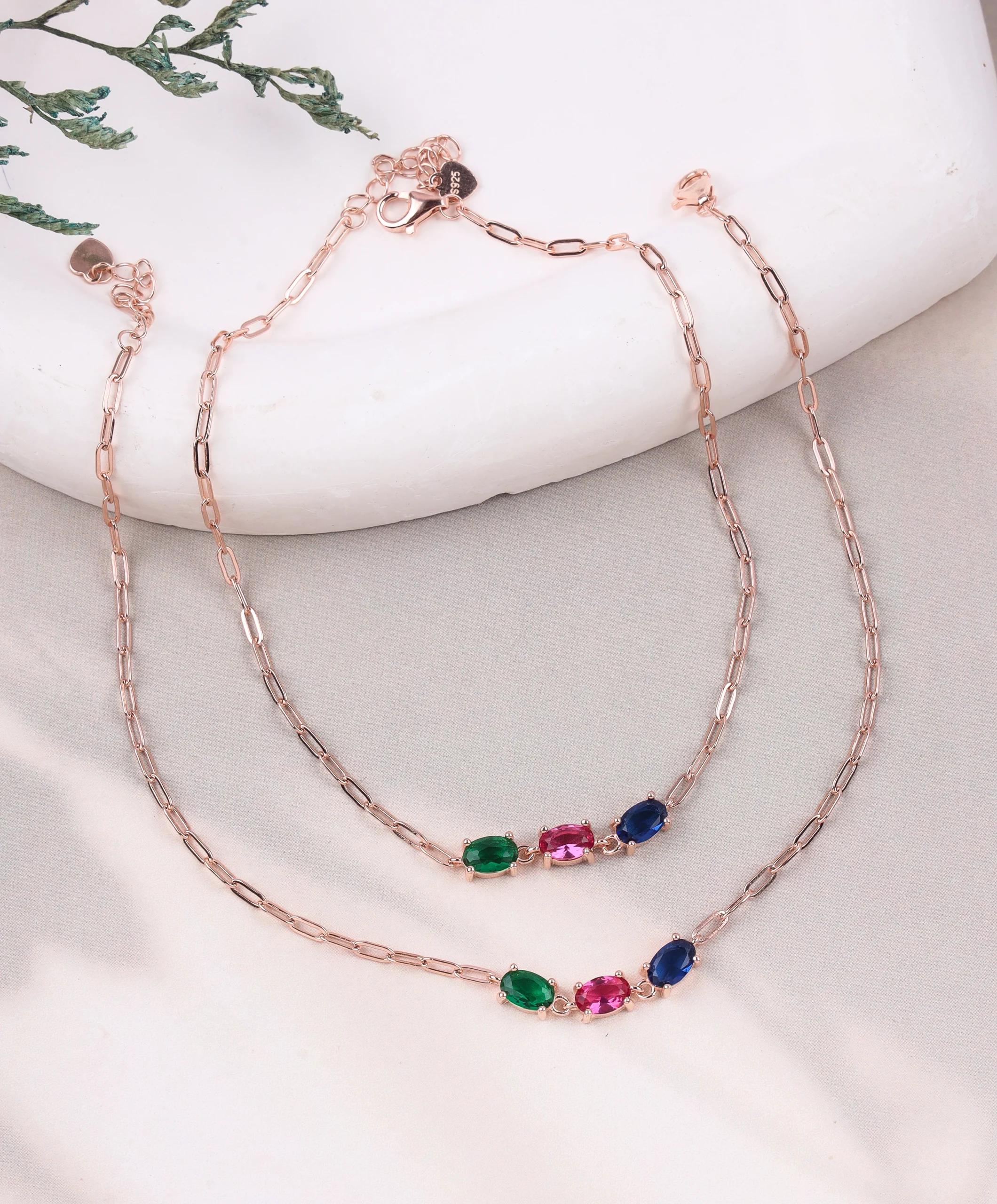 Bold, vibrant, and effortlessly elegant — the Trinity Luxe Stone Anklet is crafted in premium 925 silver and finished with rich, high-quality rose gold plating. Featuring a trio of striking high-grade stones in emerald green, ruby pink, and sapphire blue, this anklet sits beautifully on a modern paperclip chain for a luxe, contemporary look. Designed to turn heads, it’s perfect for occasions that call for a little extra sparkle and sophistication.