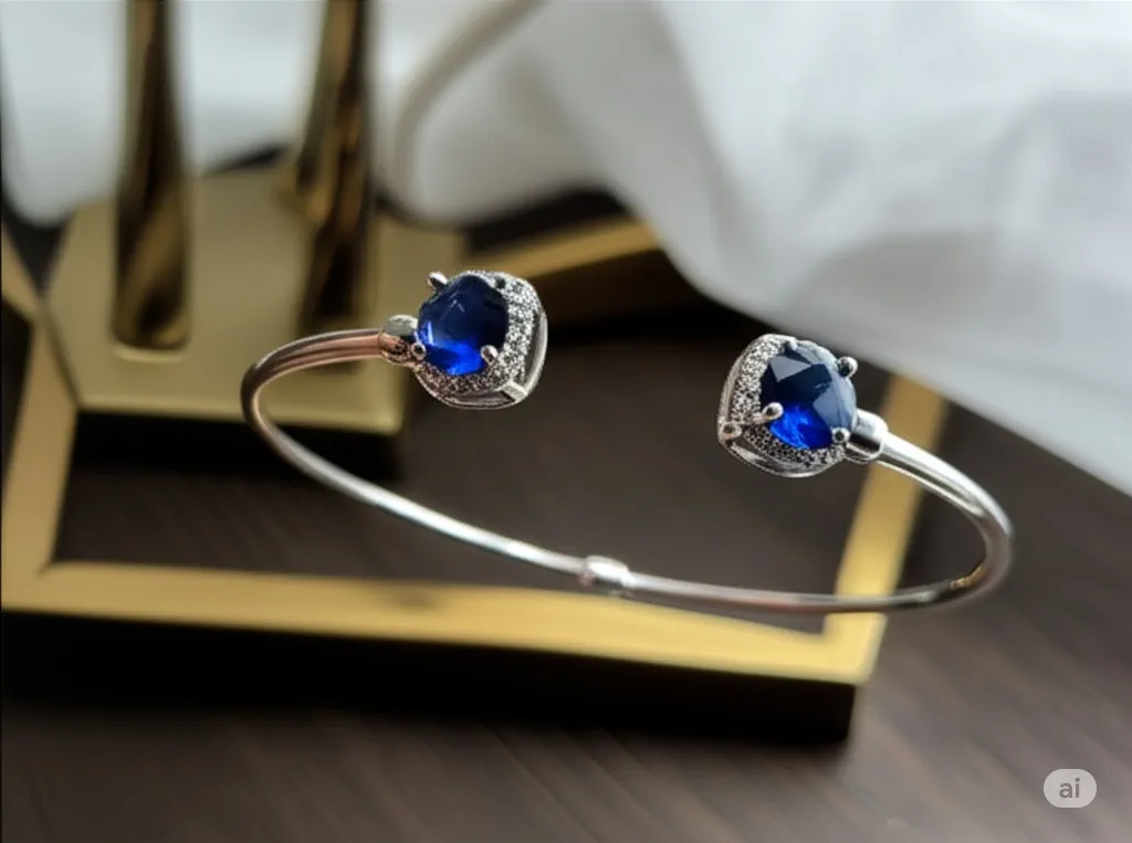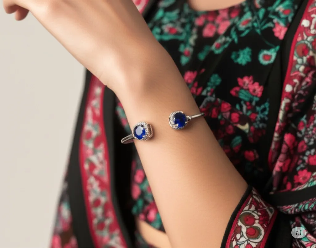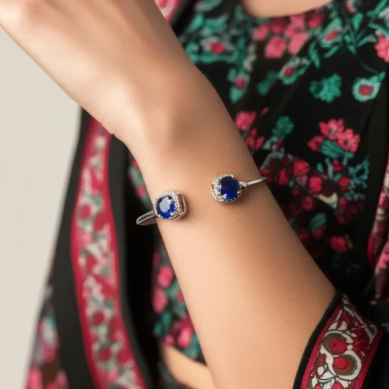 - Design: Open cuff style with twin gemstone terminals