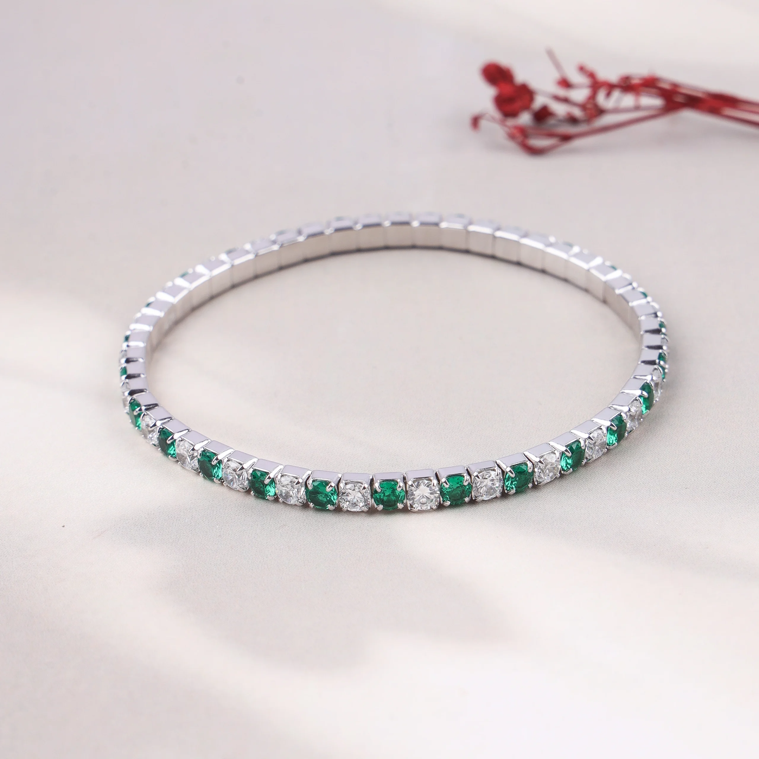 A vibrant and luxurious full-circle bangle bracelet, crafted from 925 silver with rhodium plating. This continuous band showcases an alternating pattern of brilliant square-cut emerald green cubic zirconia stones and dazzling clear cubic zirconia stones, creating a rich and opulent display of color and sparkle.Key Highlights: