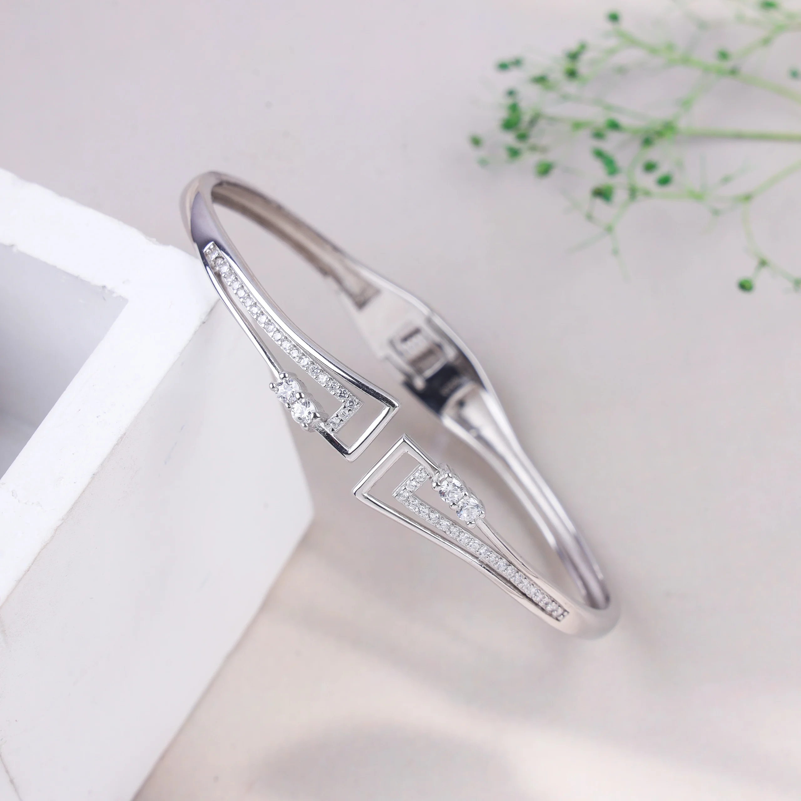 A modern and architectural open cuff bracelet made from 925 silver with rhodium plating. The design features clean lines with open geometric cut-outs that are outlined and adorned with sparkling pave-set cubic zirconia, with additional clear CZ stones set within the main structure.Key Highlights: