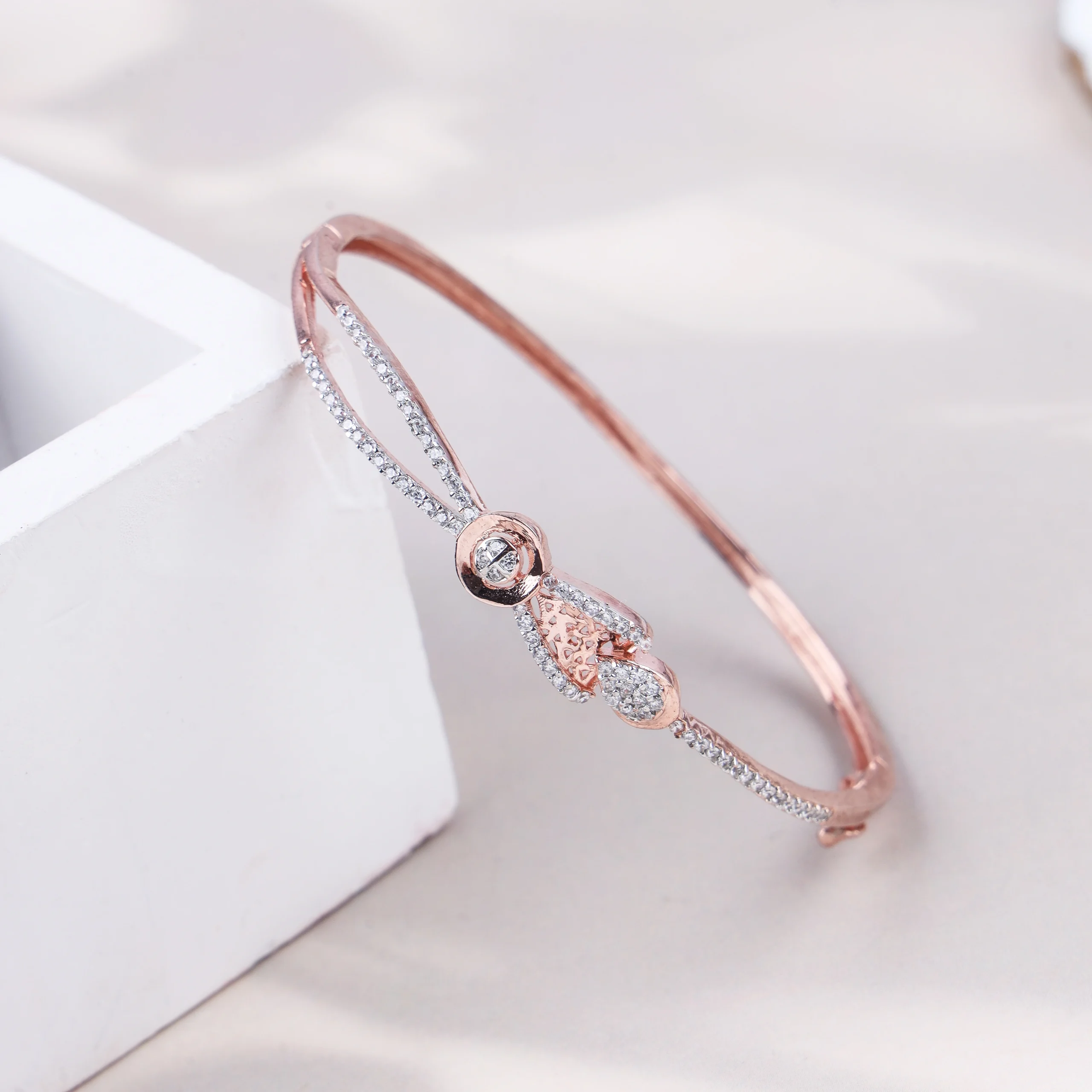 A romantic and intricate bangle bracelet fashioned from 925 silver with a radiant rose gold plating. The design features a delicate intertwining motif at the center, with sections adorned by sparkling pave-set clear cubic zirconia ansd also has a secured lock.Key Highlights: