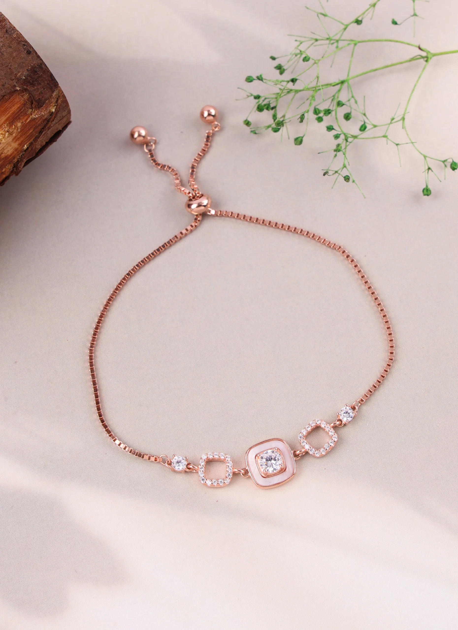 This charming bracelet is crafted from 925 sterling silver with a radiant rose gold plating, offering a warm and sophisticated appeal. It features a modern design with three distinct stations along an adjustable bolo chain. The central station showcases a luminous square mother-of-pearl inlay, framed by sparkling white zircons. Flanking it are two open geometric square motifs, each adorned with additional brilliant zircons, adding a touch of glamour. The adjustable bolo clasp ensures a comfortable and secure fit for various wrist sizes. This versatile piece is perfect for adding a chic and contemporary touch to any ensemble.