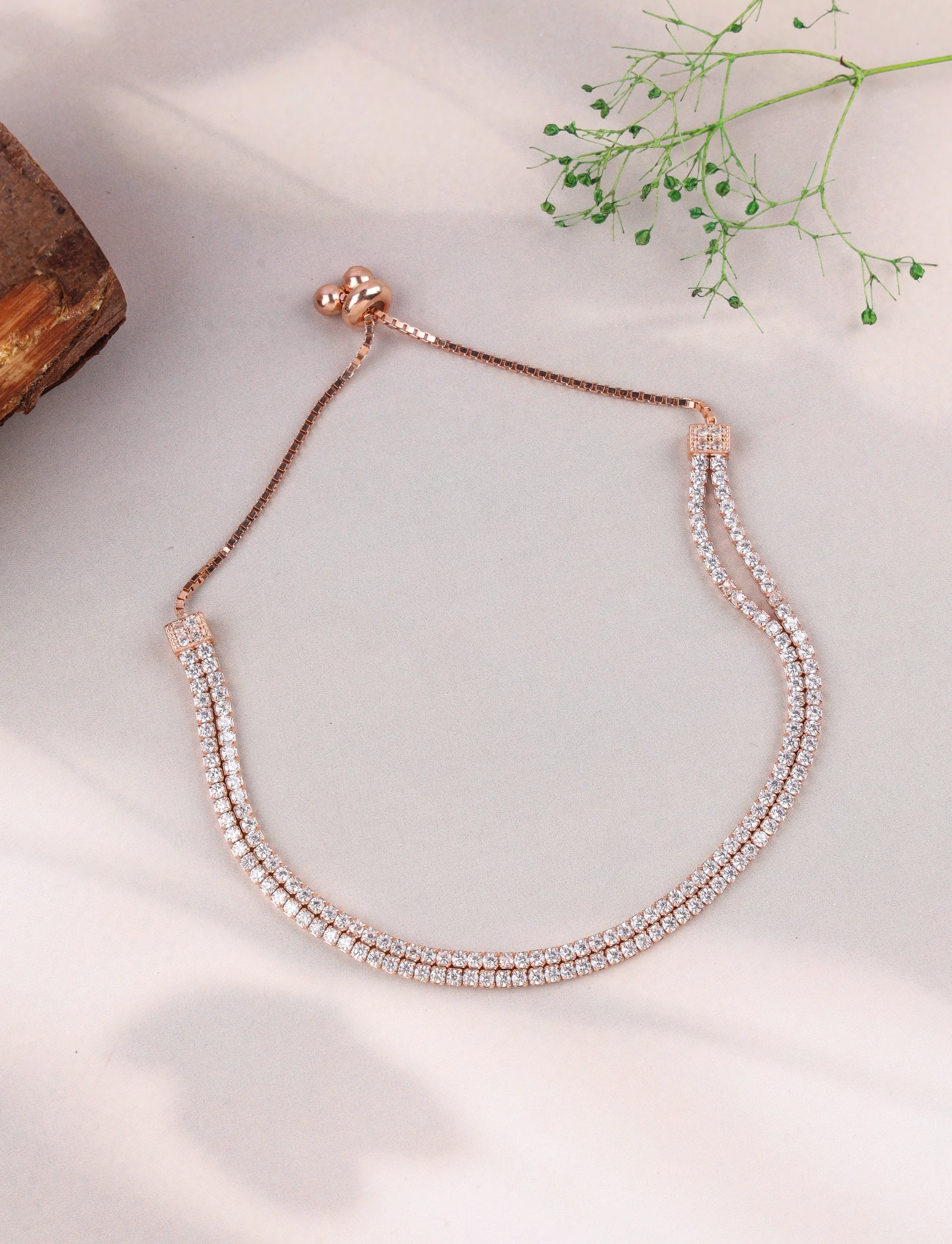 Achieve effortless glamour with this stunning Rose Gold Double Row Diamond Bolo Bracelet. Expertly crafted from premium 925 sterling silver and luxuriously finished with a radiant rose gold plating, this bracelet promises a brilliant, tarnish-resistant shine that endures. It features two continuous rows of meticulously set, high-quality American Diamonds, creating an exquisite band of sparkle that catches every light. The innovative bolo-style adjustable closure allows for a perfect and secure fit on any wrist, combining sophisticated design with ultimate wearability. This piece is a must-have for those seeking a blend of classic allure and contemporary convenience.