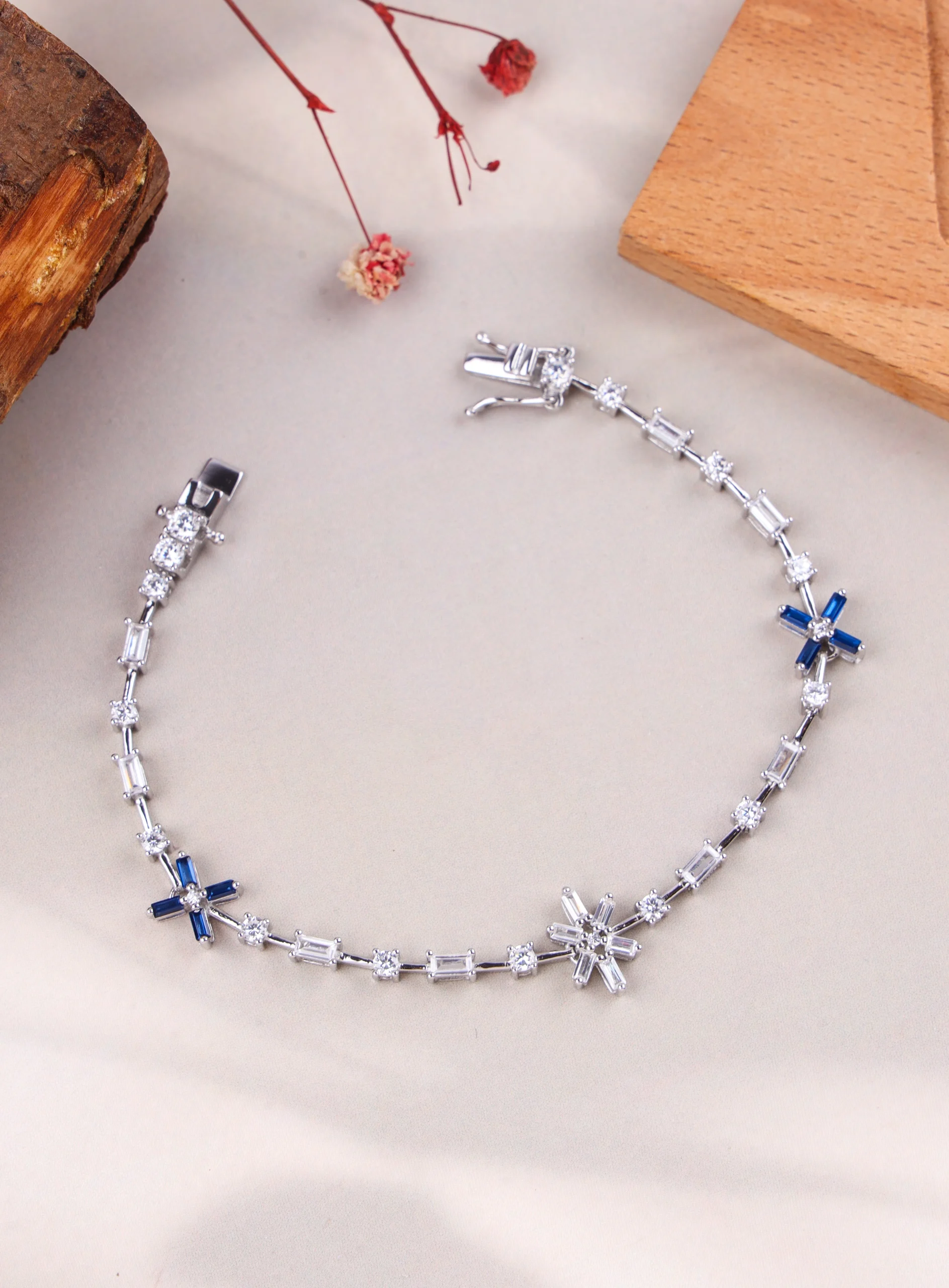 This captivating bracelet is crafted from 925 sterling silver and elegantly rhodium-plated for a brilliant, lasting shine. It features a sophisticated sequence of clear, baguette-cut American Diamonds, interspersed with dazzling starburst motifs. Two of these starbursts are strikingly adorned with vibrant sapphire-blue stones, adding a bold splash of color, while the central starburst sparkles with clear American Diamonds. Designed for a secure fit, it features a robust box clasp. This unique piece offers a blend of classic elegance and modern artistry.