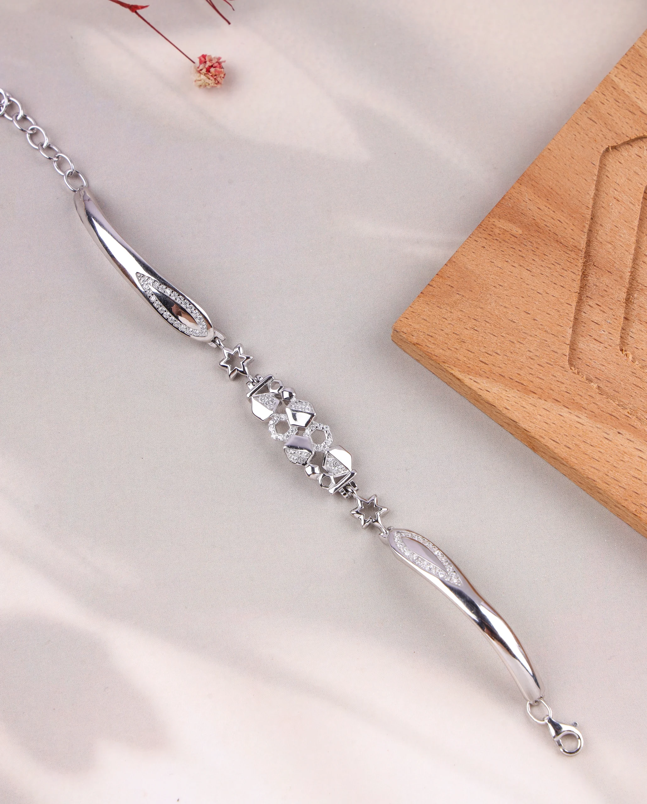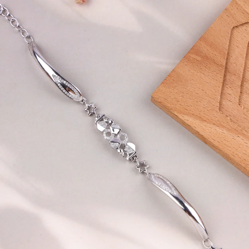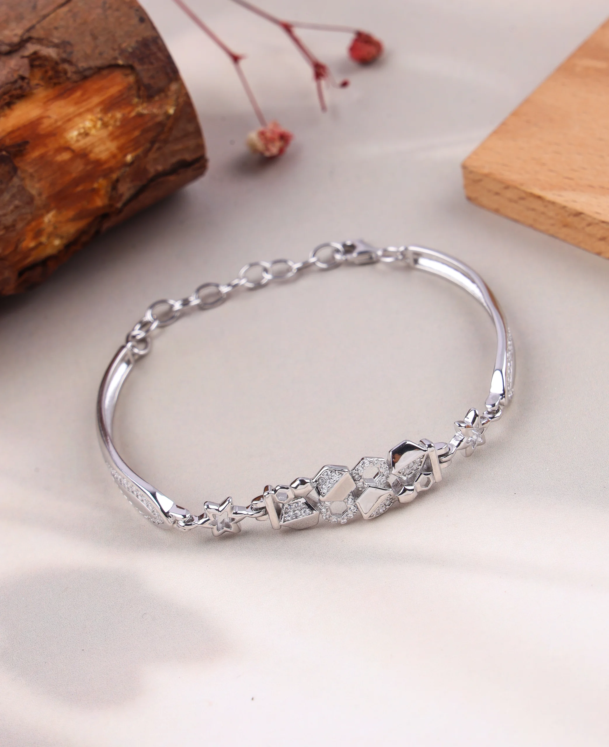 This distinctive bracelet boasts a contemporary and flowing design, meticulously crafted from 925 sterling silver and rhodium-plated for a sleek, brilliant finish. It features elegantly curved, polished silver segments that create a graceful wave-like effect. The centerpiece includes a geometric cluster of pavé-set high-quality American Diamonds, surrounded by stylized star-like motifs, adding captivating sparkle and texture. With an adjustable chain and secure lobster clasp, it offers both modern artistry and comfortable wear, perfect for making a subtle yet striking statement.