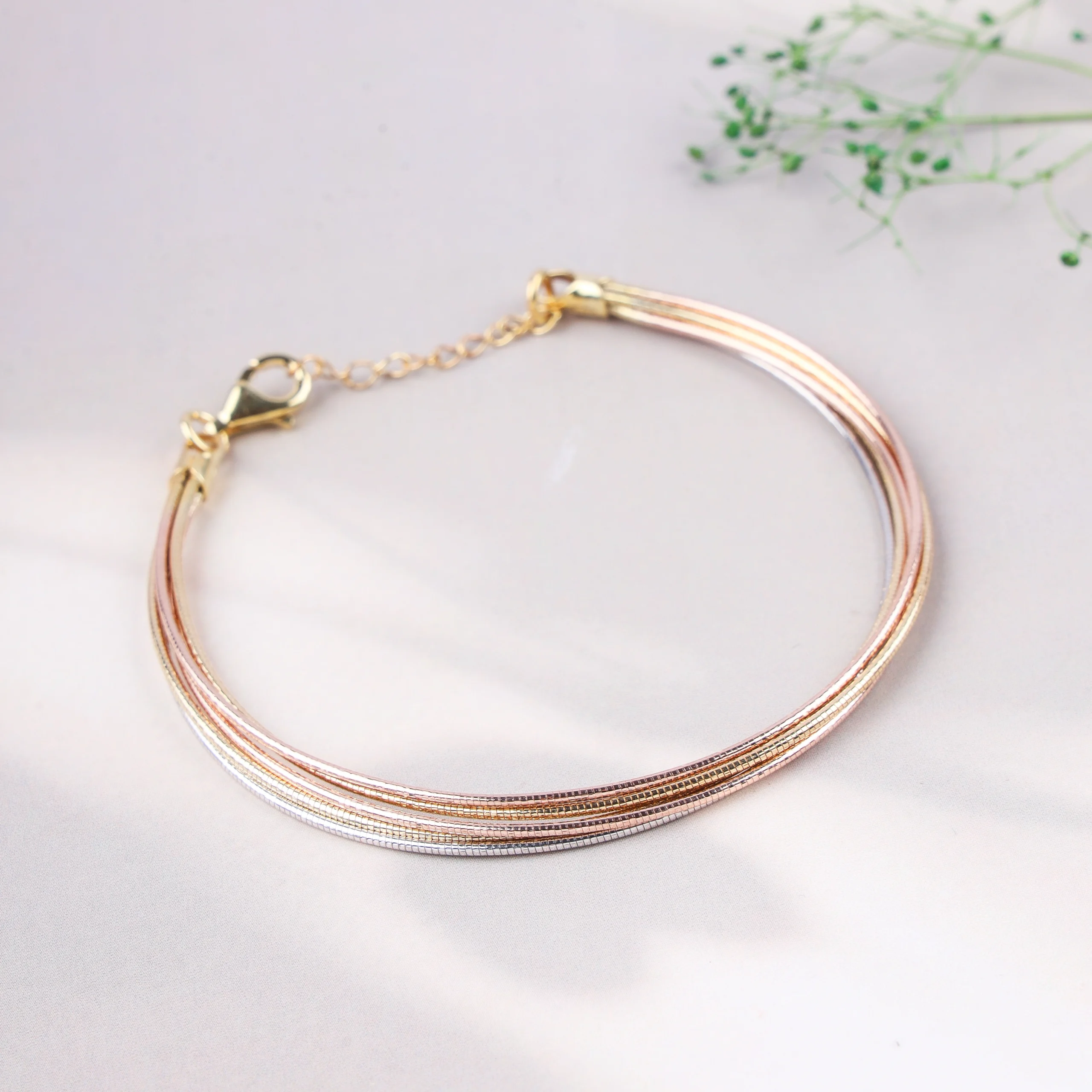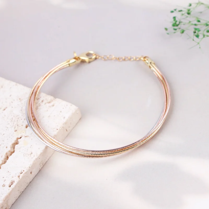 A versatile and chic multi-strand bracelet featuring five delicate snake chains in a captivating mix of rhodium, rose gold, and yellow gold platings over 925 silver. This design creates a beautiful tri-tone effect, secured with an adjustable clasp for a comfortable fit.Key Highlights: