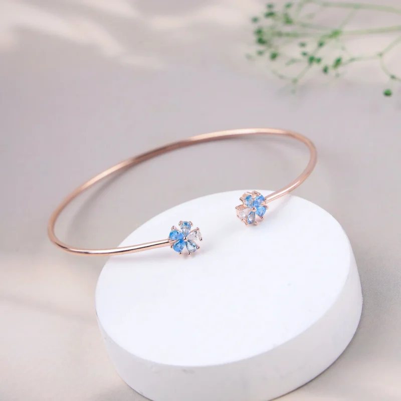 This charming open cuff bracelet is crafted from 925 silver with a delicate rose gold plating. Each end features a petite floral or clover-like cluster of four marquise-cut light blue cubic zirconia stones, surrounded by small pave-set clear cubic zirconia, creating a gentle burst of color and sparkle.Key Highlights: