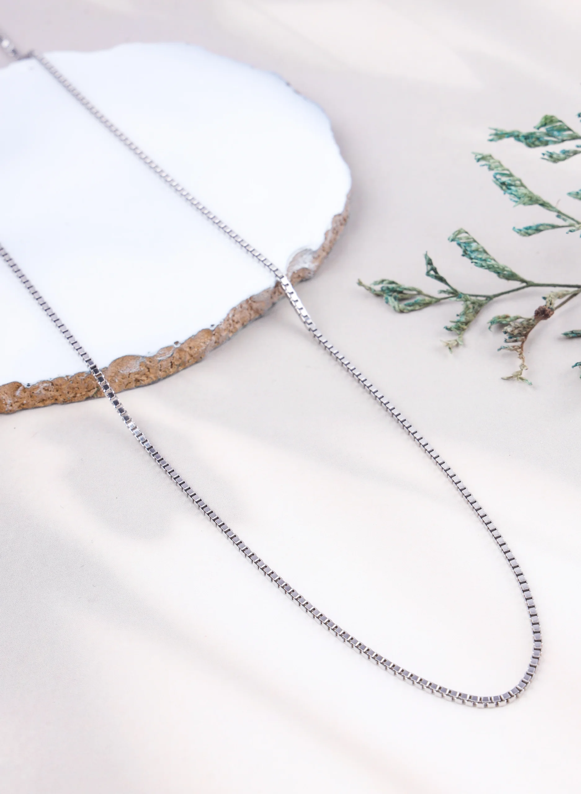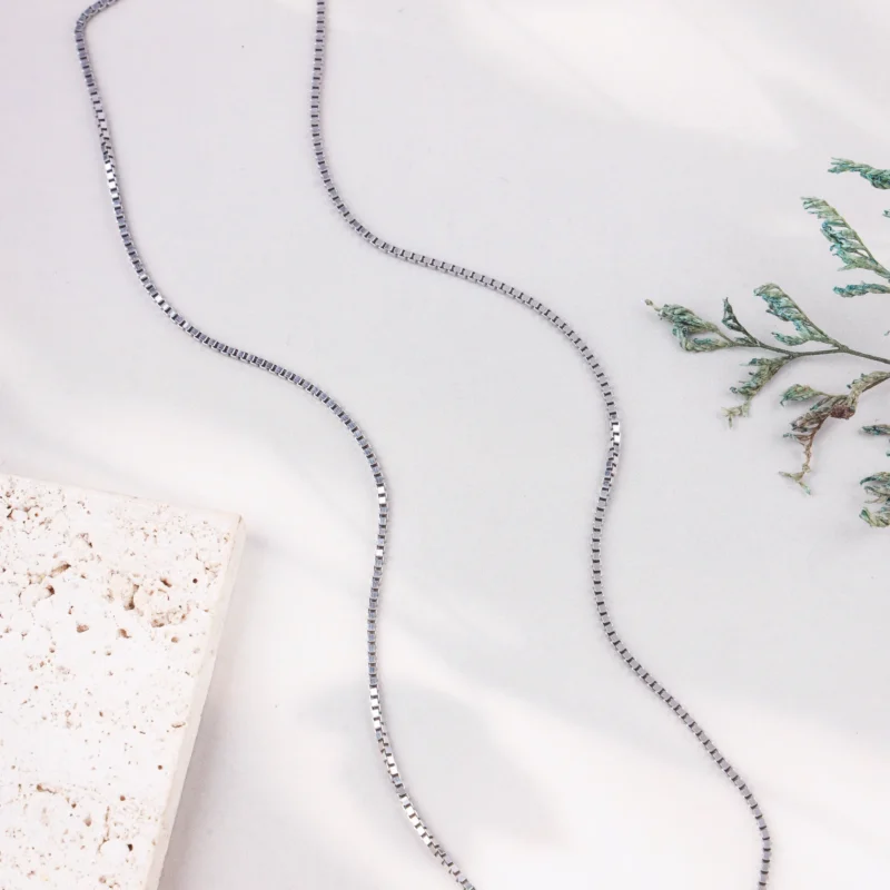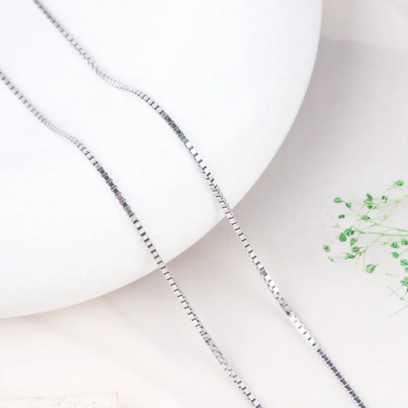 Characterized by its square or box-shaped links, this chain offers a sleek and modern aesthetic. Made from premium 925 silver and expertly rhodium-plated, it boasts exceptional durability and a permanent, lustrous finish that will not tarnish. Its smooth, uniform texture makes it ideal for showcasing pendants or wearing on its own for a refined look.
