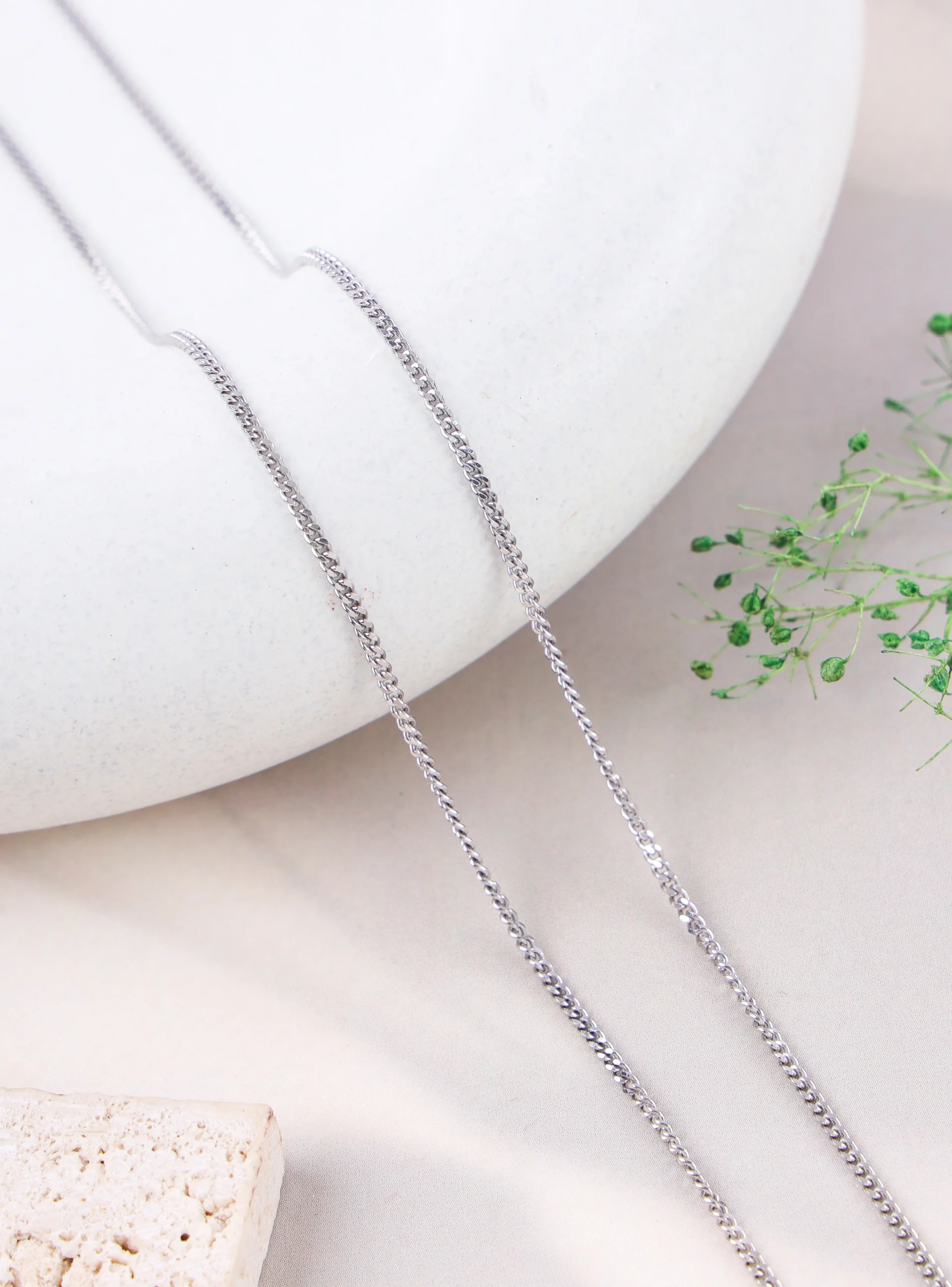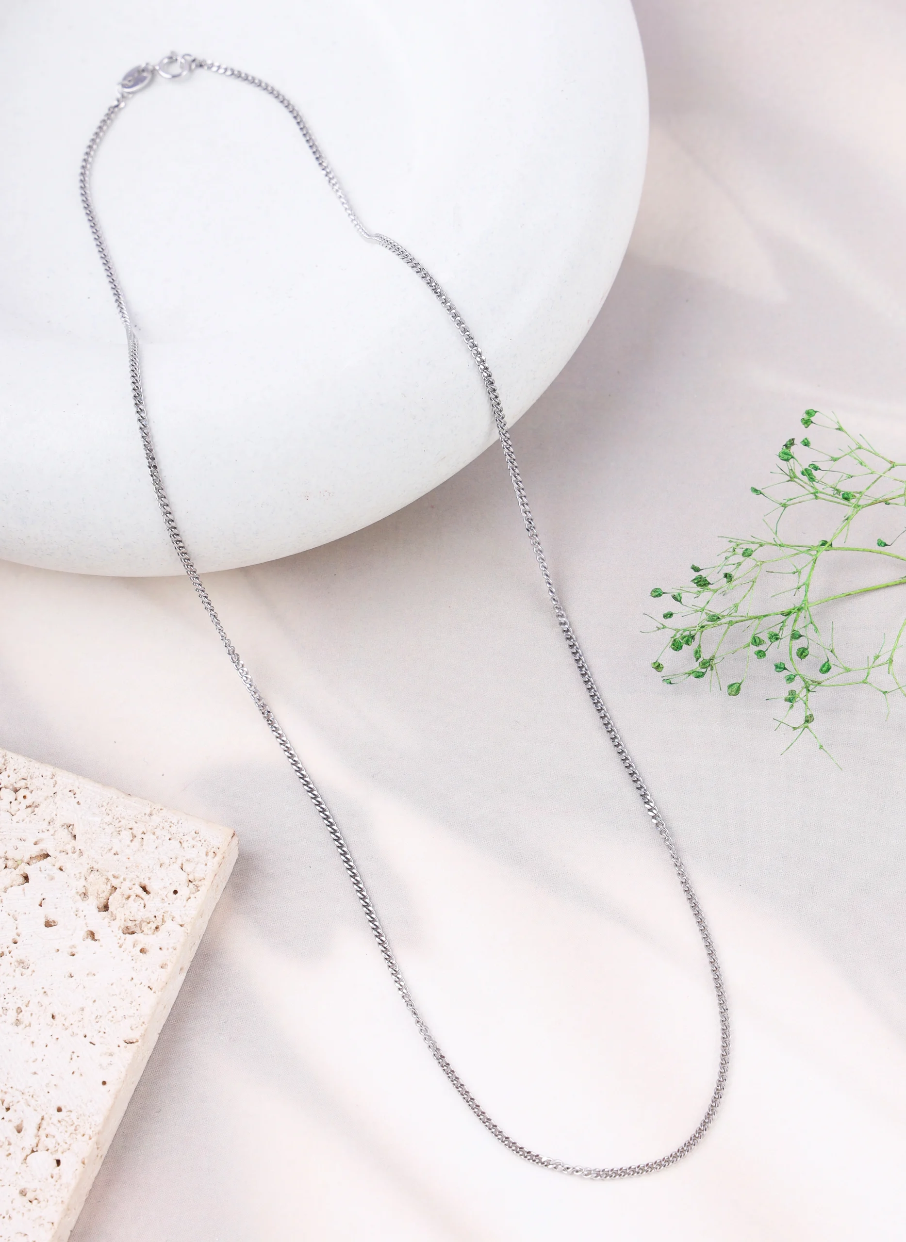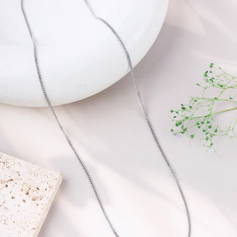 This timeless and versatile chain features interlocking, uniformly-sized links that lie flat. Crafted from high-quality 925 silver and enhanced with rhodium plating, it offers a brilliant, lasting shine that resists tarnishing, ensuring its beauty endures. Its classic design makes it perfect for everyday wear or as a foundation for your favorite pendant.