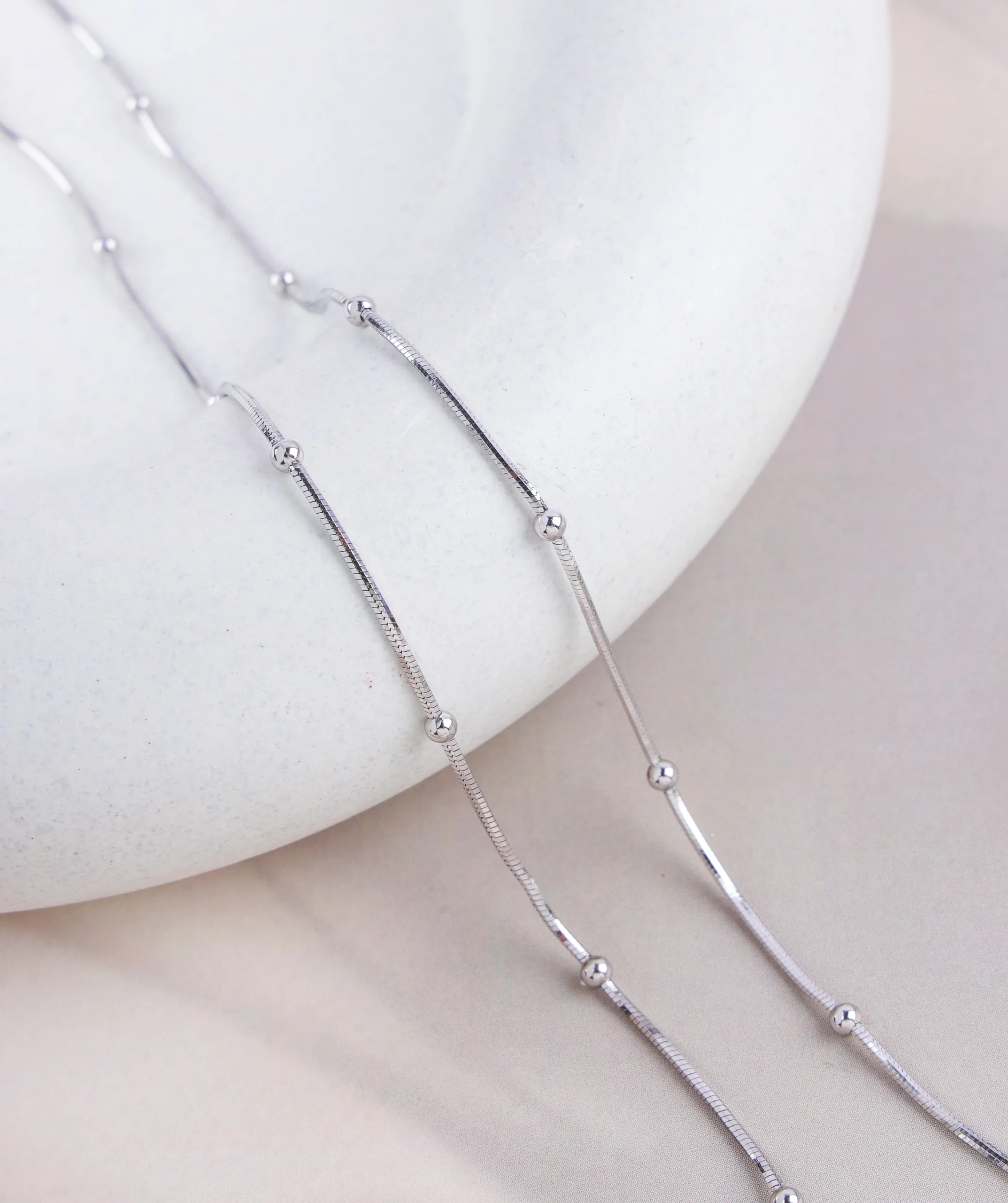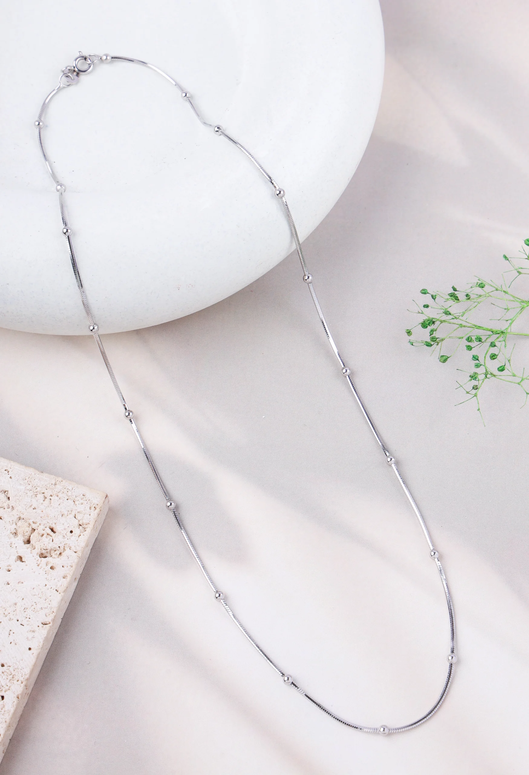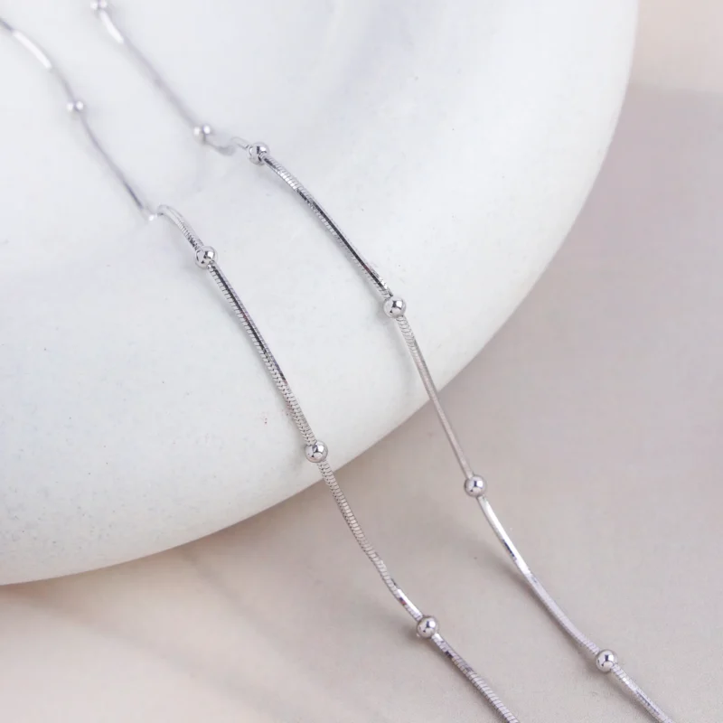 This delicate and charming chain features small, evenly spaced beads or “satellites” along a slender chain. Constructed from 925 silver and finished with a protective rhodium plating, it guarantees a brilliant, tarnish-free shine that lasts indefinitely. It’s a perfect choice for adding subtle sparkle and texture, whether worn solo or layered with other necklaces.