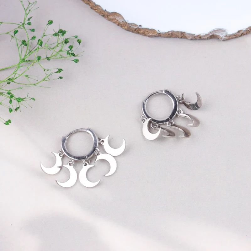 These elegant earrings are crafted from 925 sterling silver, known for its durability and shine. Each earring features a classic hoop design from which multiple crescent moon charms gracefully dangle. The polished silver finish enhances the intricate details of the moon shapes, creating a celestial-inspired look. These lightweight earrings are perfect for adding a touch of whimsy and sophistication to any outfit, suitable for both everyday wear and special occasions.