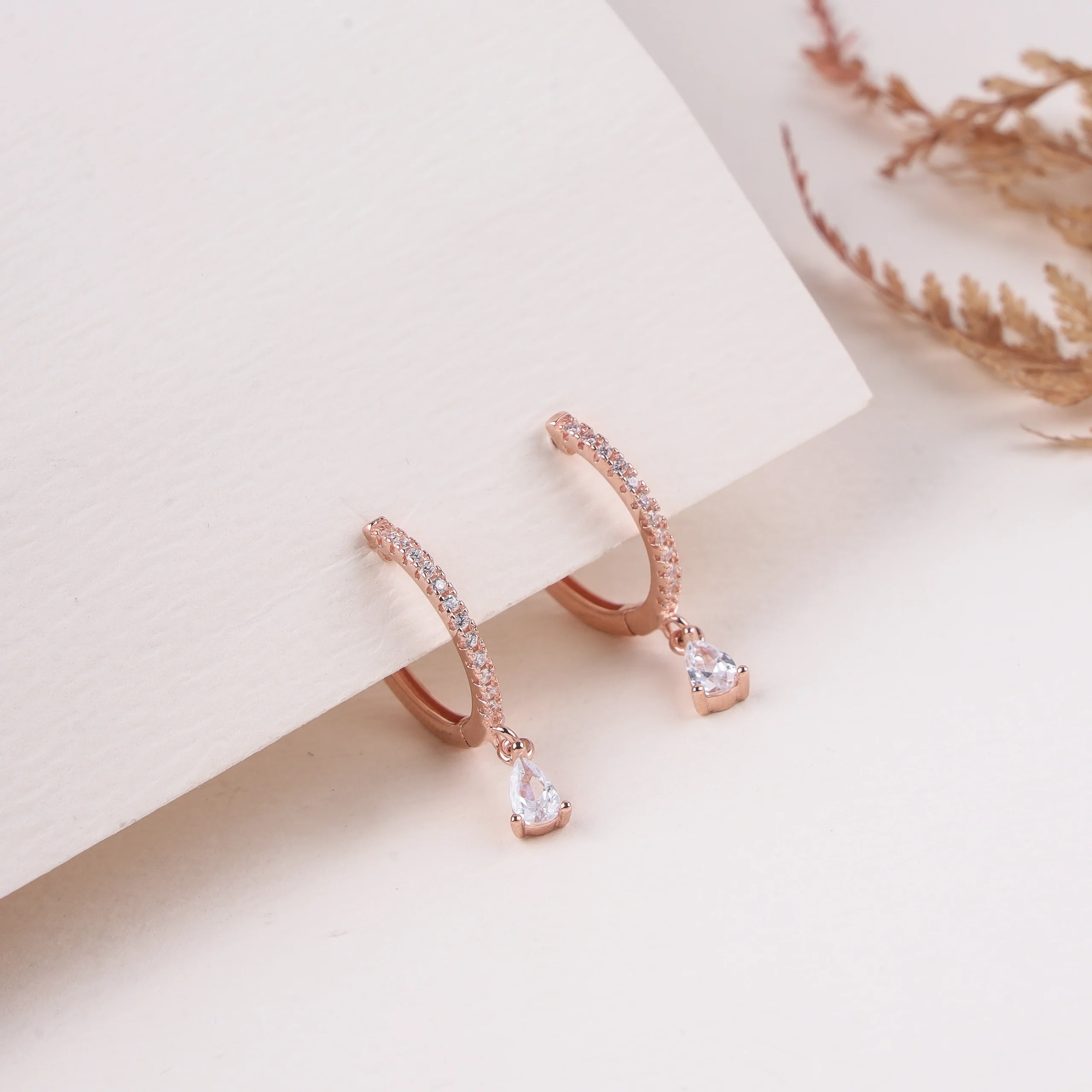 These elegant and delicate hoop earrings feature a warm rose gold-tone finish. Each small hoop is beautifully adorned with a row of shimmering clear cubic zirconia stones along its front, adding a continuous line of sparkle. Gracefully suspended from the bottom of each hoop is a single, brilliant pear-cut clear cubic zirconia stone, which catches the light with every movement. Crafted from high-quality 925 sterling silver, these earrings offer a sophisticated blend of modern design and classic charm. The gentle curve of the hoop and the dangling teardrop create a refined silhouette, perfect for adding a touch of understated glamour to any outfit.