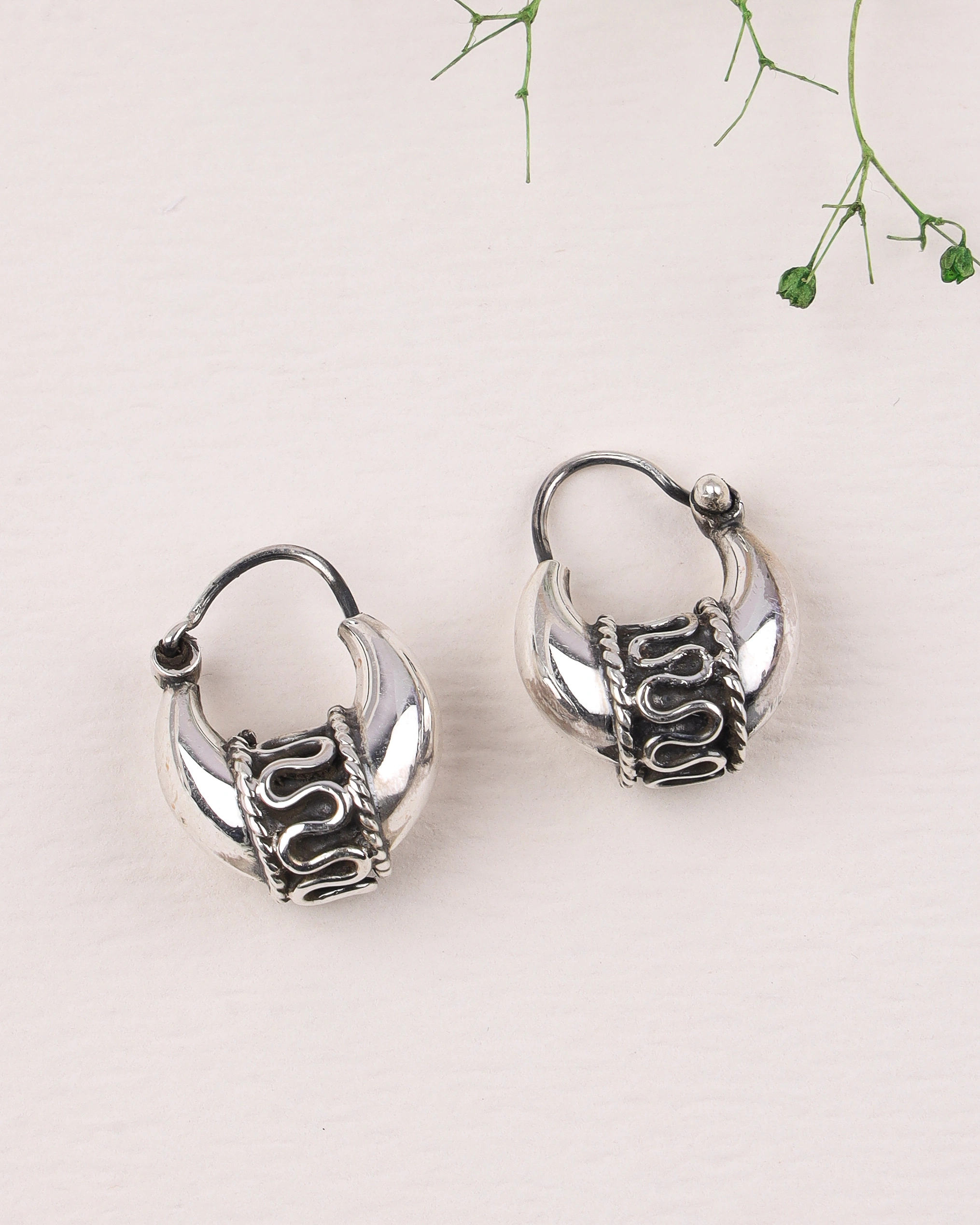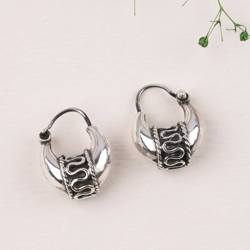 Unique and culturally inspired, these chunky mini hoop earrings are crafted from oxidized 925 silver, giving them an antique look. They feature intricate twisted rope detailing on the front, adding a touch of rustic charm and distinctiveness.Key Highlights: