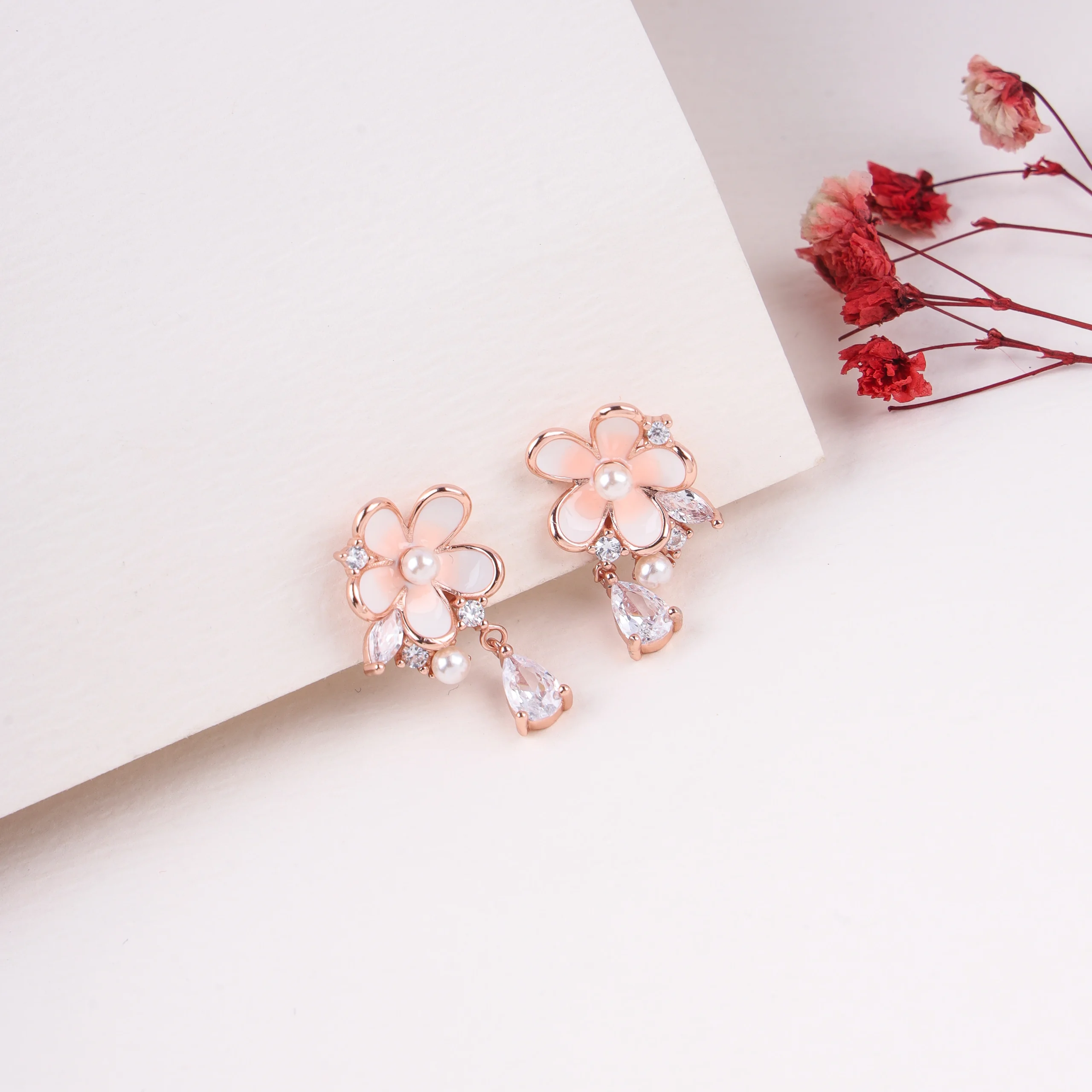 These elegant and charming drop earrings are crafted from 925 sterling silver with a warm rose gold plating. Each earring features a beautiful pink enamel flower with a sparkling zircon center and a delicate pearl-like accent. Dangling gracefully below are two brilliant marquise-cut zircons and a dazzling pear-shaped zircon drop, adding significant sparkle and movement. This design offers a sophisticated blend of floral grace and radiant shine. Key Highlights: Rose gold plating, pink enamel flower, pearl and zircon accents, marquise and pear zircon drops, elegant dangle.