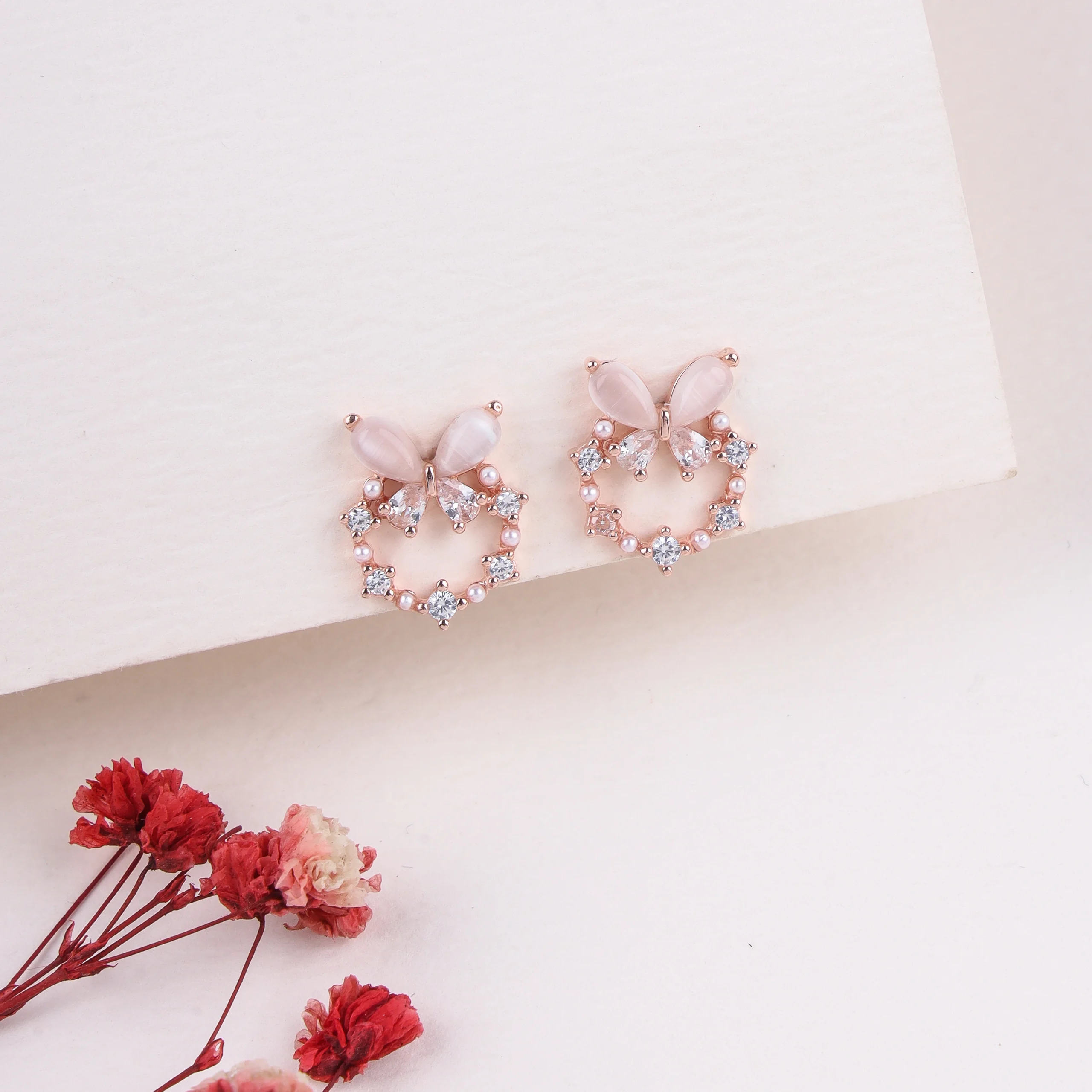 Key Highlights: Rose gold plating, butterfly motif, cat eye and zircon accents, delicate, charming stud.