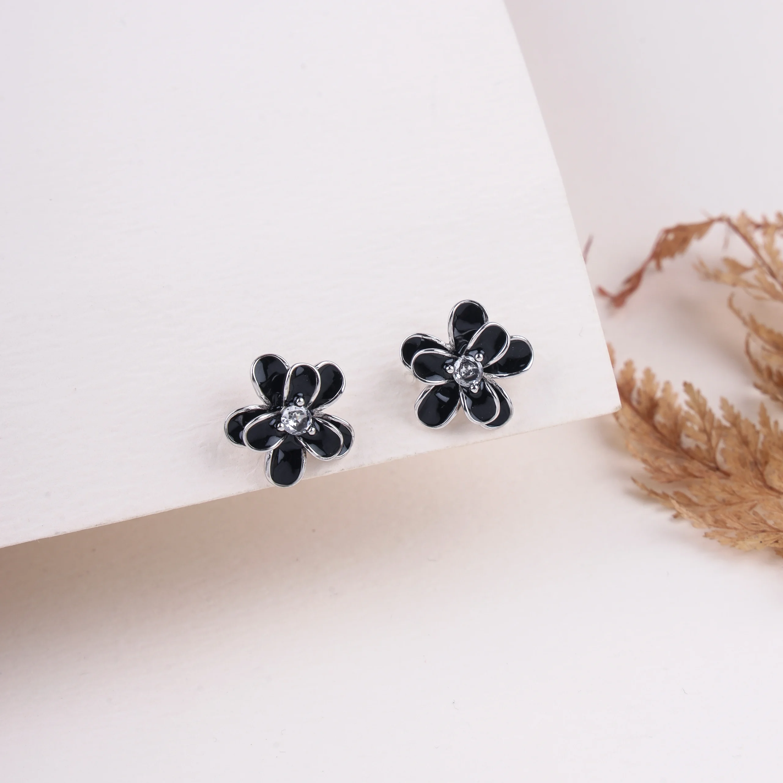 These elegant stud earrings feature a five-petal flower design, with each petal crafted from a rich, glossy black enamel, creating a striking contrast against the metal. A single, brilliant clear cubic zirconia stone sparkles at the very center of each bloom. Crafted from high-quality 925 sterling silver with rodium plating, these earrings offer a sophisticated and modern take on floral jewelry, perfect for adding a chic touch to any outfit.