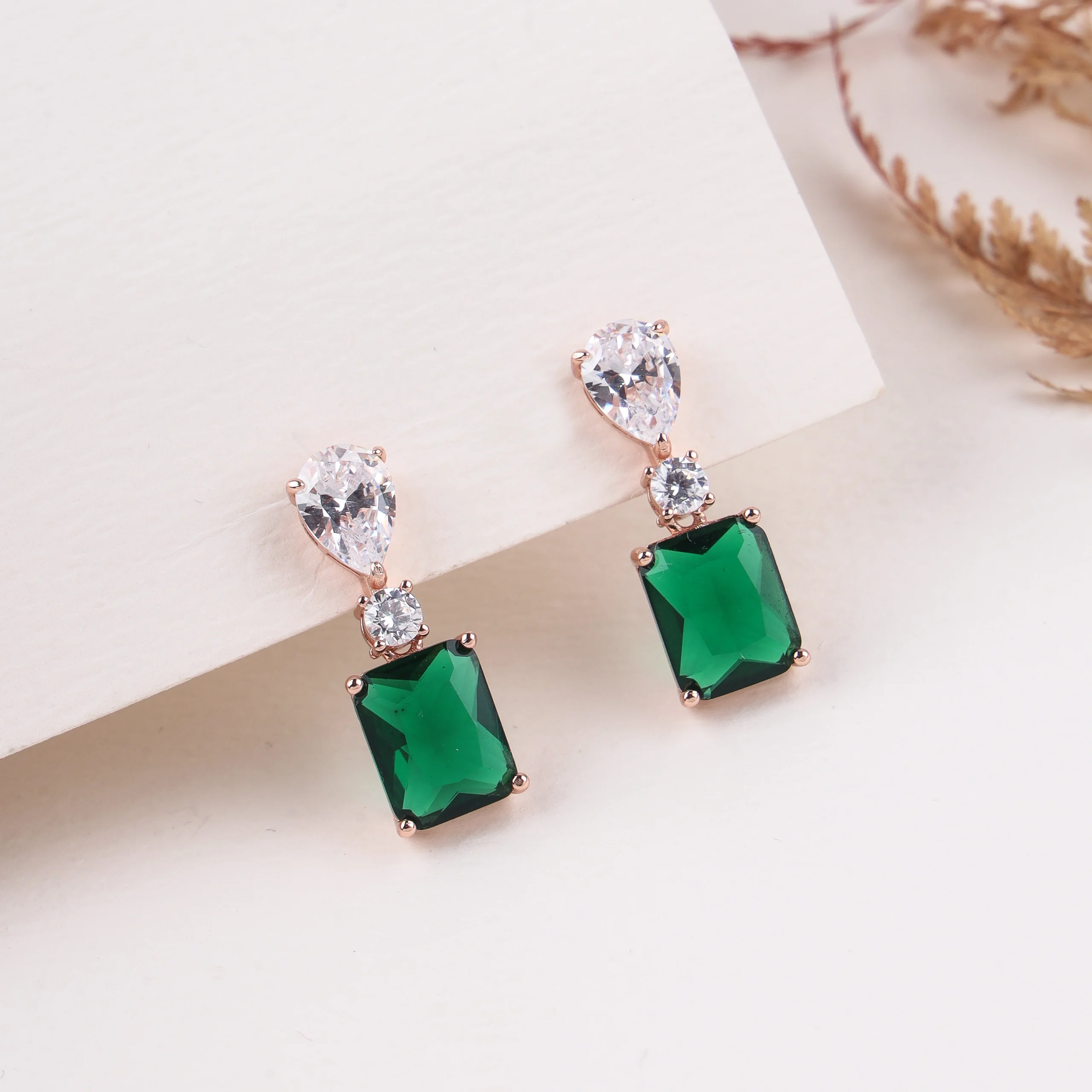 These elegant dangle earrings feature a captivating design, beginning with a brilliant pear-cut, high-quality cubic zirconia (evoking Swarovski brilliance) at the earlobe. Below, a sparkling round-cut cubic zirconia connects to a stunning rectangular-cut emerald green, high-quality cubic zirconia that gracefully suspends. The warm rose gold-tone setting beautifully complements the vivid green and clear stones. Crafted with meticulous attention to detail, these earrings offer a sophisticated and luxurious sparkle, perfect for adding a touch of glamour to any ensemble.