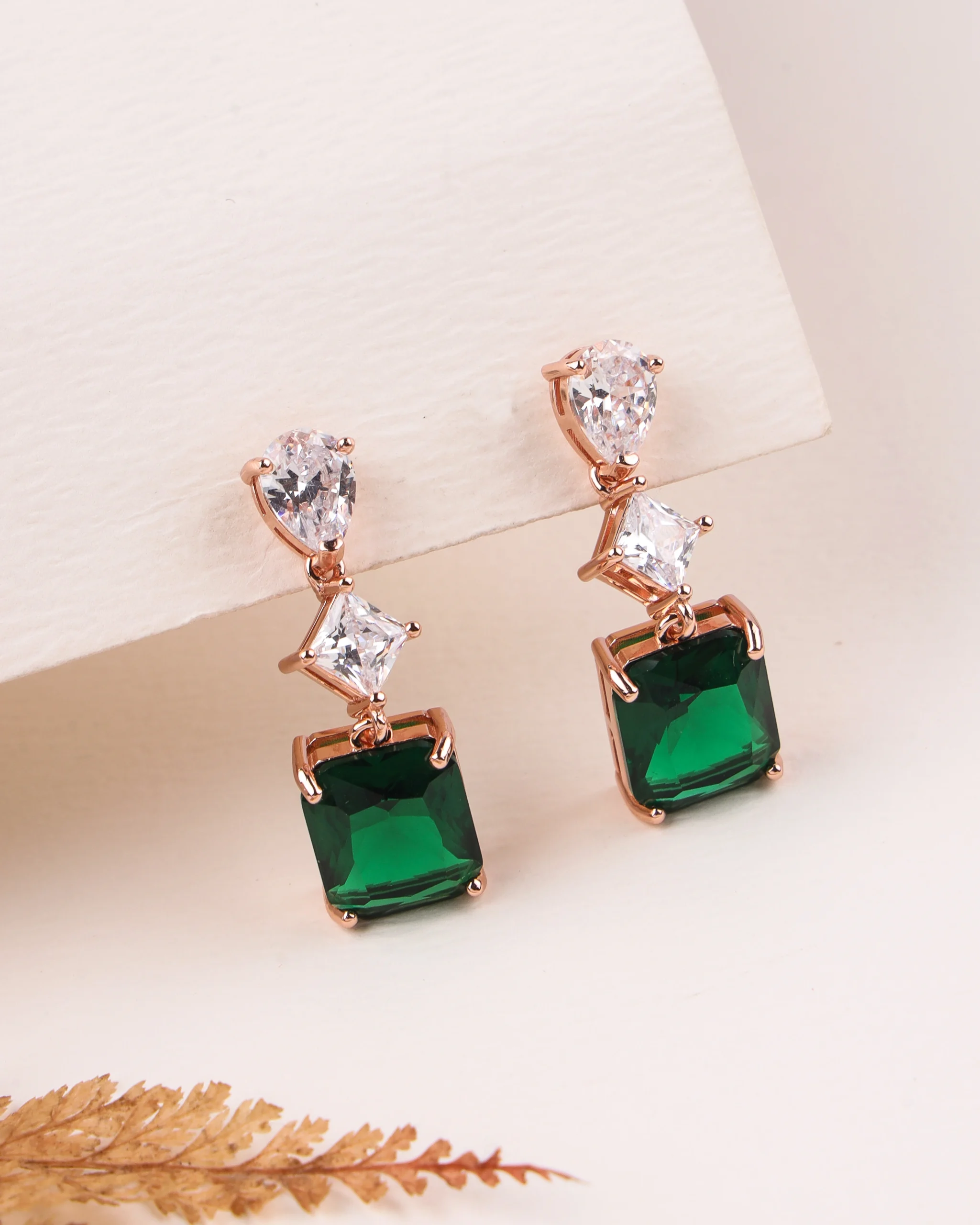 These luxurious dangle earrings are crafted from 925 silver with a rose gold plating. They feature a striking cascade of three geometrically cut cubic zirconia stones: a pear-cut at the top, a square princess-cut in the middle, and a captivating emerald-cut emerald green cubic zirconia at the bottom.Key Highlights