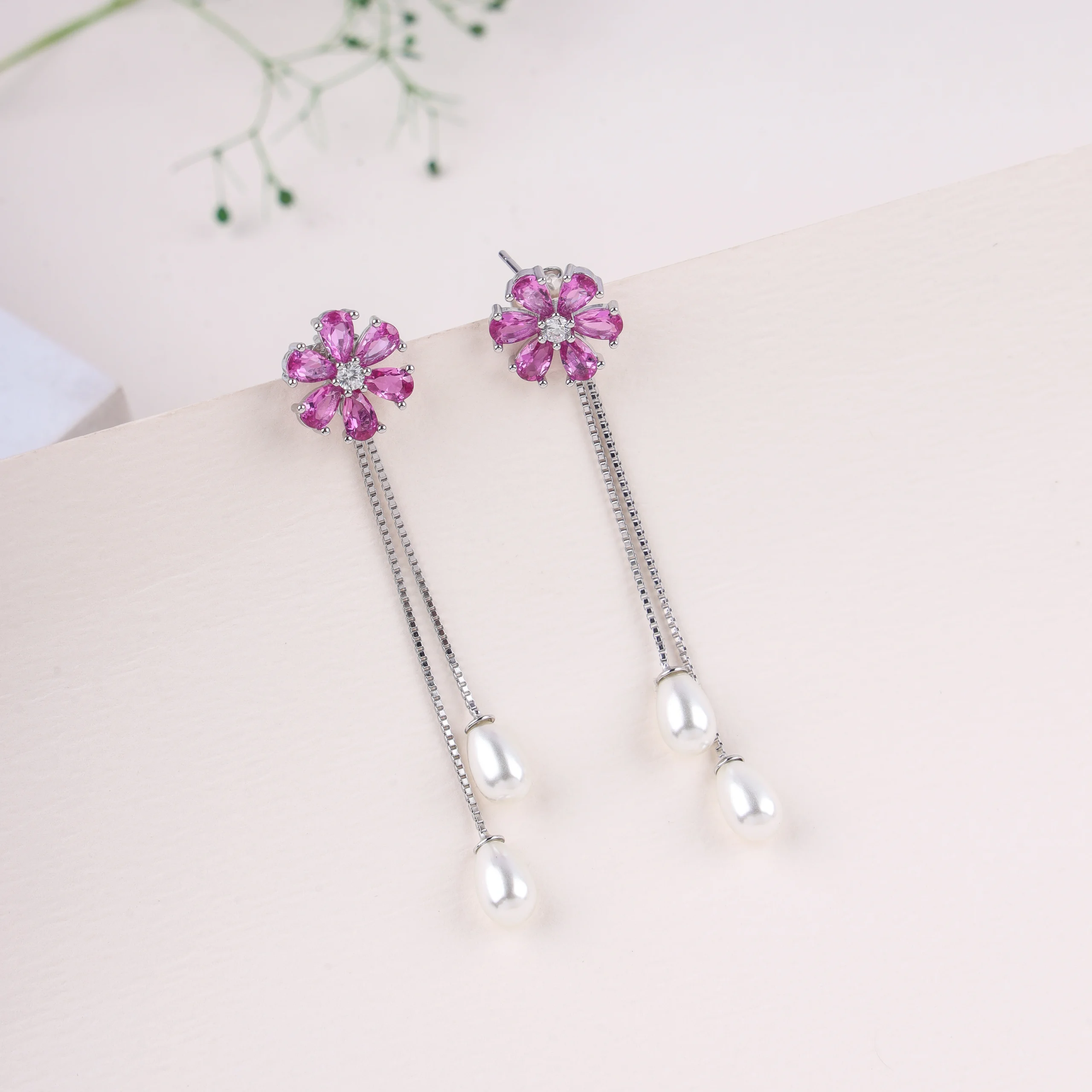 These elegant stud earrings feature a captivating floral design at the earlobe, crafted with brilliant pink marquise-cut cubic zirconia stones forming petals around a sparkling clear center. From this exquisite bloom, delicate silver-tone chains gracefully descend, each adorned with two luminous teardrop-shaped pearls. The varying lengths of the chains create a subtle, graceful movement, adding a touch of sophistication and charm to these unique dangle earrings. Perfect for adding a pop of color and classic elegance to any outfit.