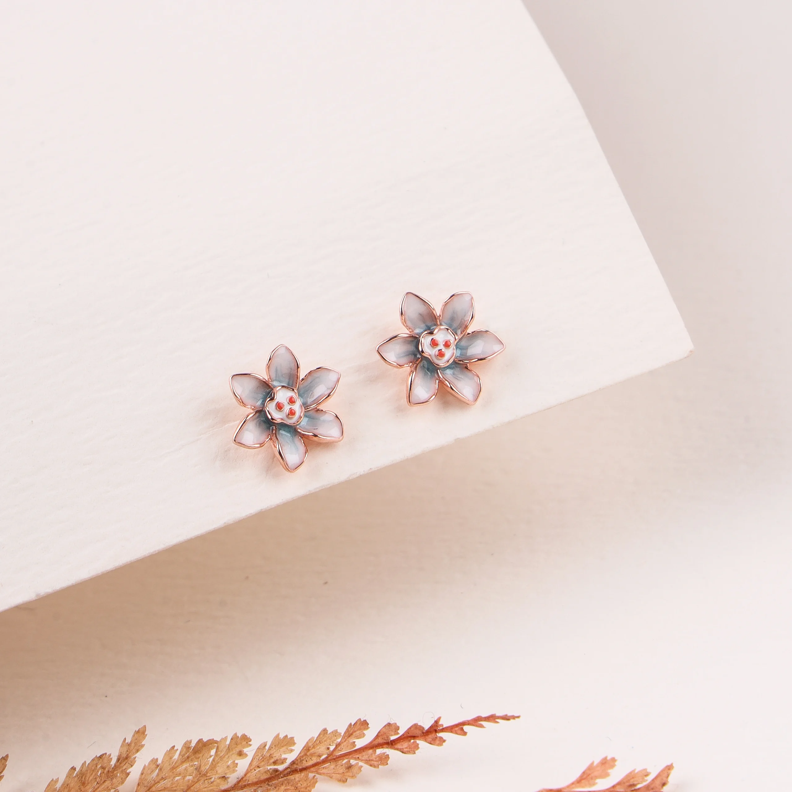 These charming stud earrings are designed in the shape of a delicate five-petal flower. Each petal is rendered in a beautiful soft blue or greyish-blue enamel, with subtle variations in tone that give them depth. A small, contrasting red or dark dot is placed at the center of each bloom, adding a unique detail. The earrings are crafted from high-quality 925 sterling silver and finished with a warm rose gold plating, enhancing their gentle hues. These whimsical studs are perfect for adding a touch of subtle color and natural charm to your everyday look.
