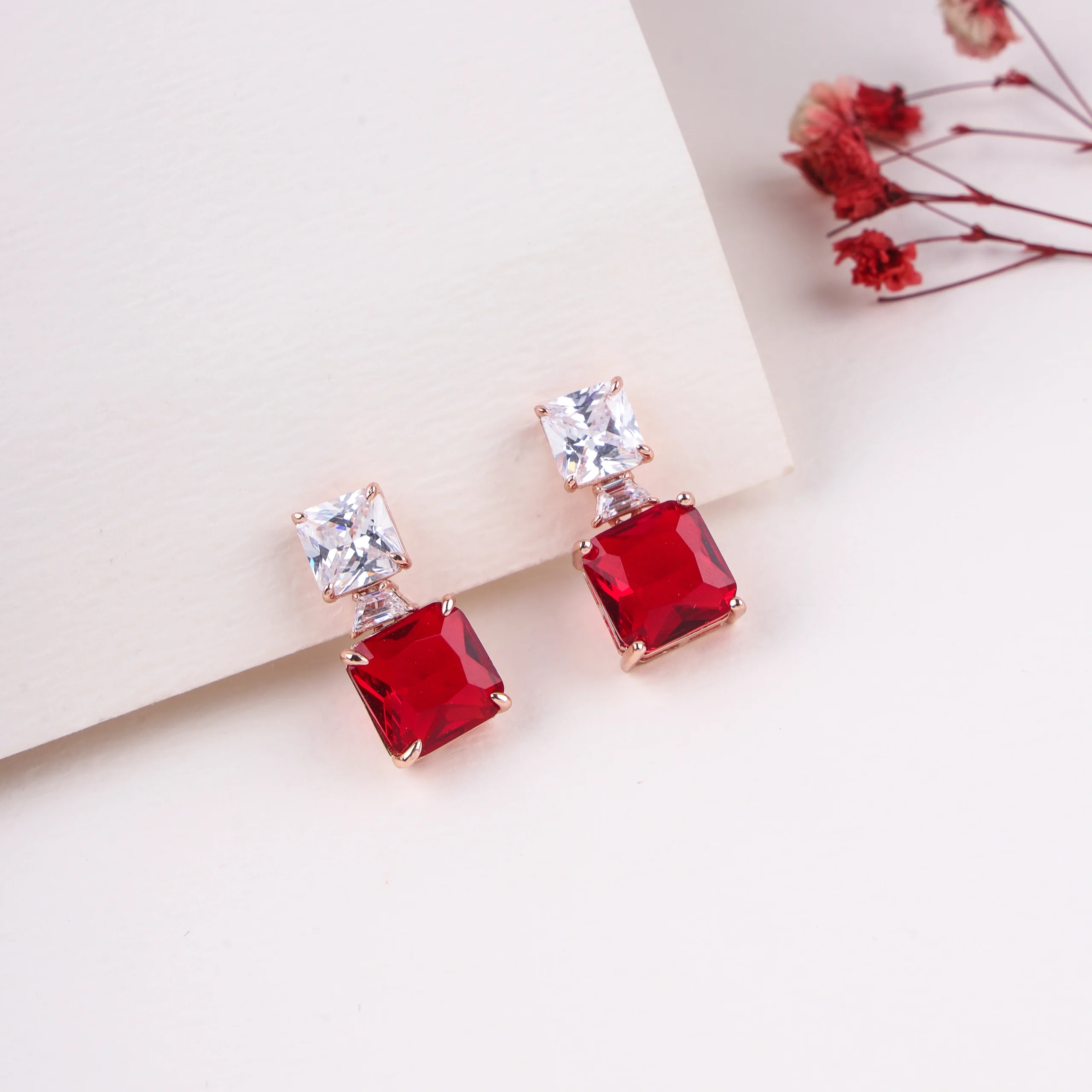 These striking drop earrings are crafted from 925 sterling silver with a luxurious rose gold plating. Each earring features a vibrant emerald-cut ruby red zircon as the main dangle, crowned by a smaller, sparkling square-cut white zircon. The rich red hue beautifully contrasts with the brilliance of the white zircon and the warmth of the rose gold, creating a bold and elegant statement. Key Highlights: Rose gold plating, emerald-cut red zircon, square white zircon, bold color, classic elegance.