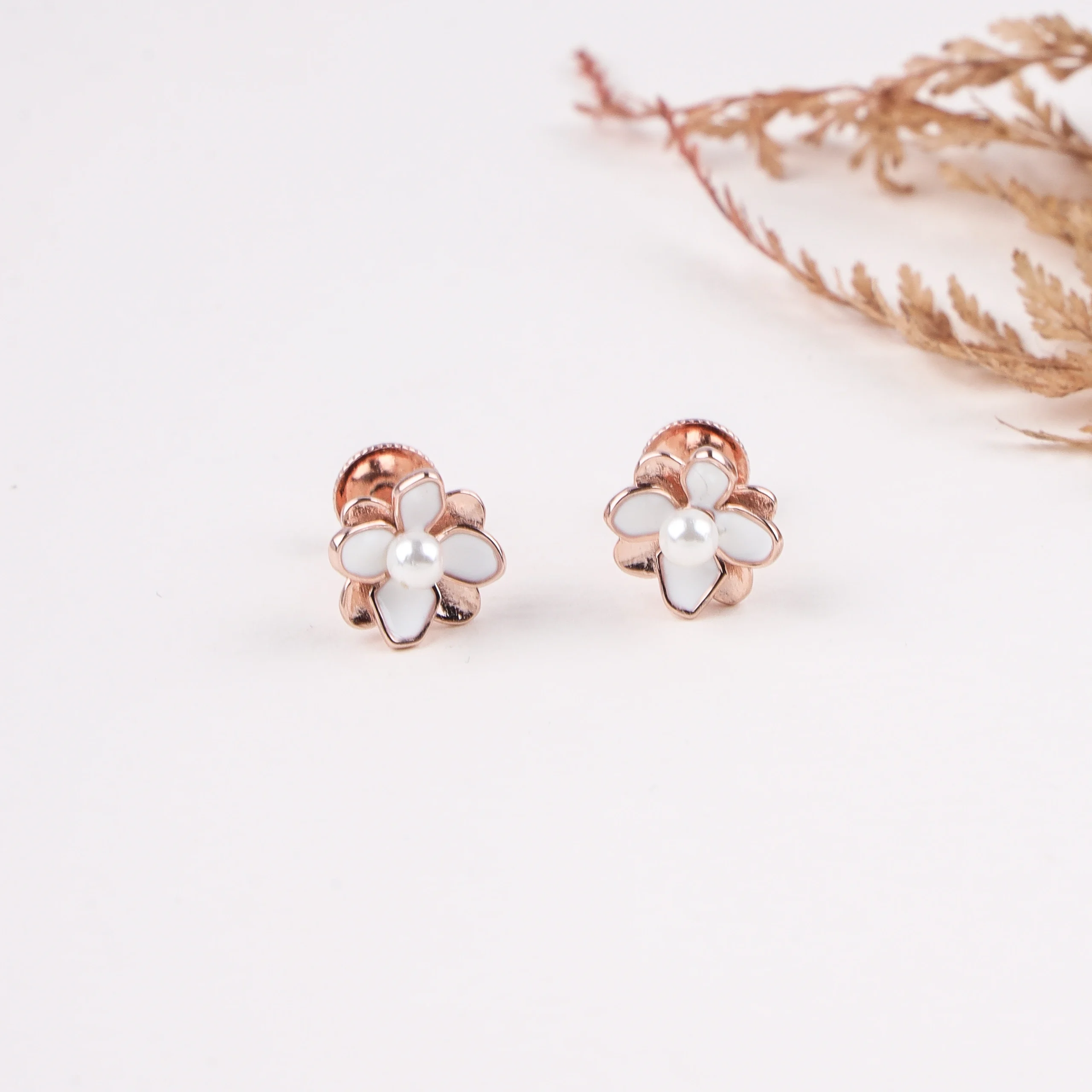 Description: These delicate stud earrings are designed in the shape of a charming five-petal flower. Each petal is beautifully rendered in smooth, opaque white enamel, creating a clean and elegant look. A lustrous white pearl is perfectly nestled at the center of each bloom, adding a classic touch. The earrings are crafted from high-quality 925 sterling silver and finished with a warm rose gold plating, giving them a soft, romantic glow. These studs are ideal for adding a touch of subtle floral elegance and vintage-inspired charm to your everyday style.