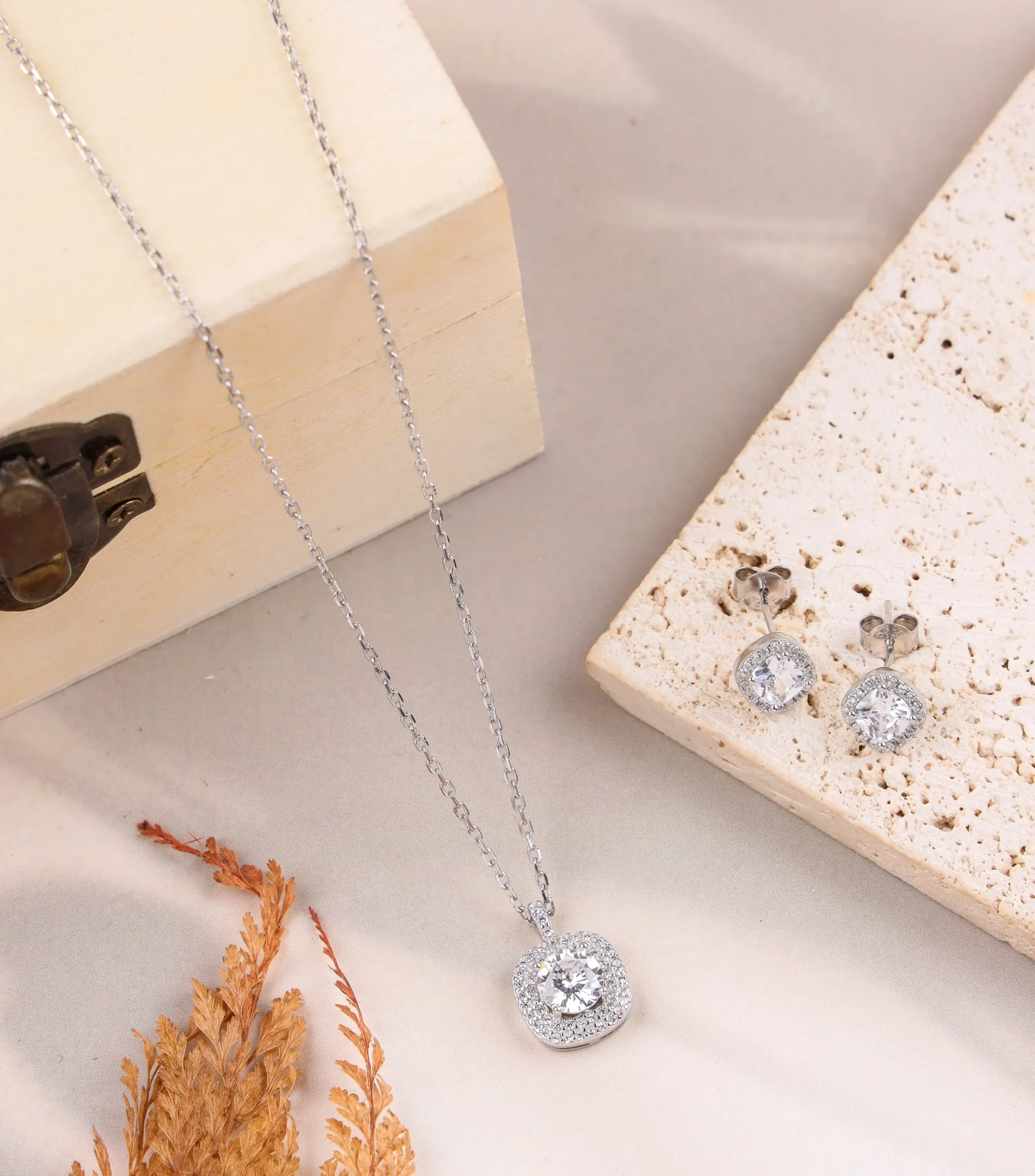 Radiate classic elegance with our Halo Cushion Cut Set. This timeless necklace and earring set is meticulously crafted from premium 925 sterling silver and finished with a brilliant rhodium plating for a long-lasting shine. The necklace features a dazzling cushion-cut solitaire stone, beautifully framed by a halo of smaller pavé-set stones. This design maximizes the sparkle and brilliance of the central gem. The matching stud earrings perfectly complement the necklace, showcasing the same stunning halo-style cushion cut. This set is a versatile and sophisticated choice for any occasion. The necklace chain is 18 inches with a 2-inch extension, offering a customizable fit.