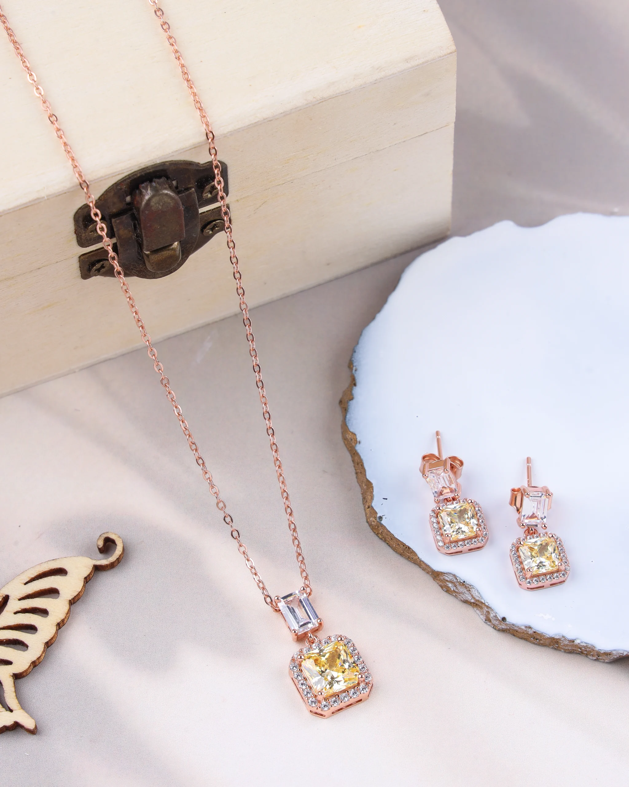 Radiate a captivating warmth with our Amber Pavé Dainty Set. This exquisite set features a necklace and matching drop earrings, all crafted from 925 sterling silver and finished with a luxurious rose gold plating. The necklace showcases a brilliant cushion-cut amber-colored stone, beautifully framed by a halo of sparkling pavé-set stones. The coordinating earrings feature a similar design, with a small, clear stone above the main pendant for a subtle drop effect. This set is a perfect blend of rich color and dazzling sparkle. The necklace chain is 18 inches with a 2-inch extension, allowing for versatile styling.