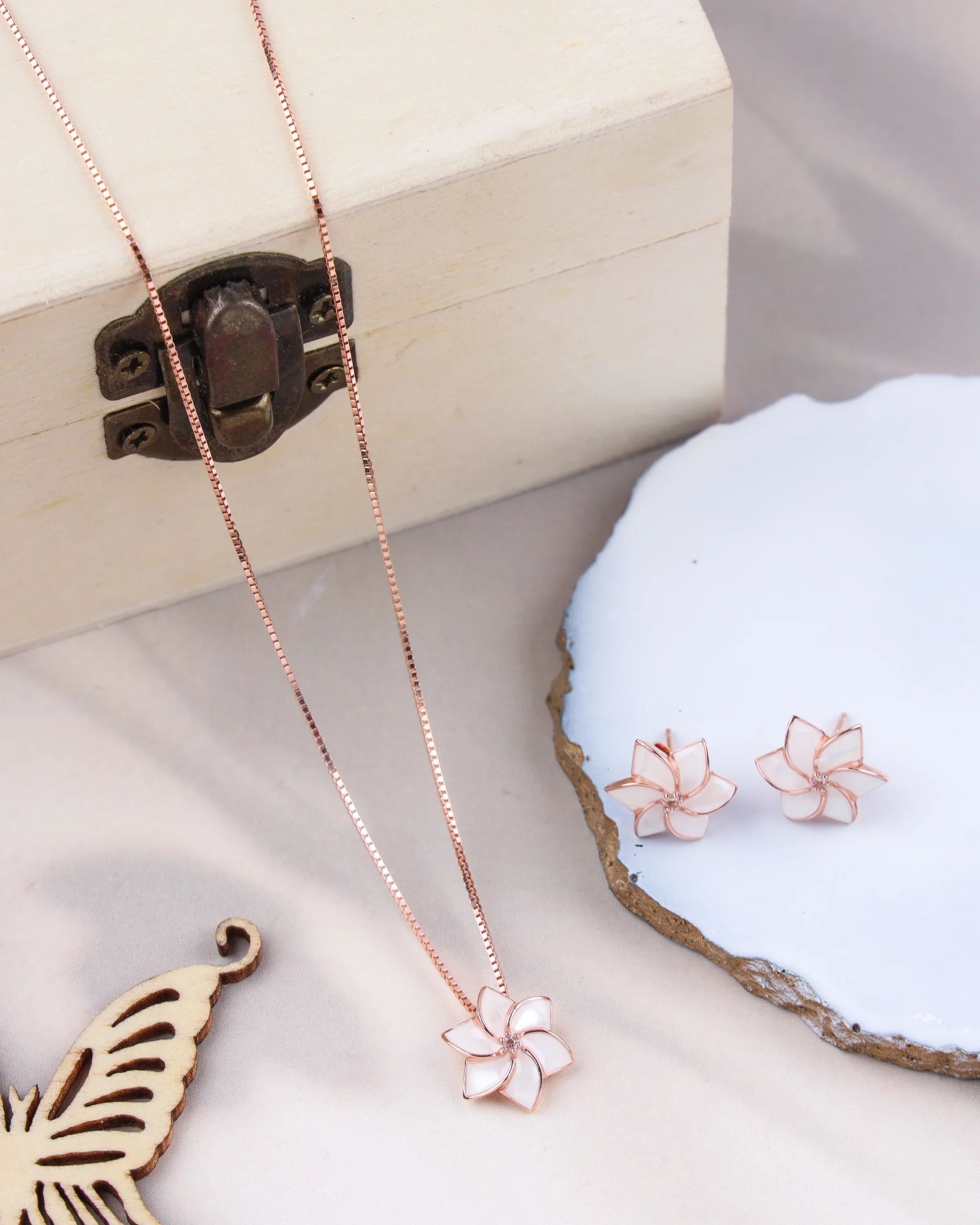 Embrace nature’s beauty with our Mother of Pearl Bloom Set. This charming necklace and earring set is crafted from high-quality 925 sterling silver and finished with a warm rose gold plating. The centerpiece of the necklace is a beautiful, open-petaled flower, with each petal made from real seashell for a unique, iridescent shimmer. The matching stud earrings continue this delicate floral motif, featuring a smaller, matching flower. This set is a feminine and elegant choice for adding a touch of natural beauty to any ensemble. The necklace is designed with an 18-inch chain and a 2-inch extension for adjustable comfort.