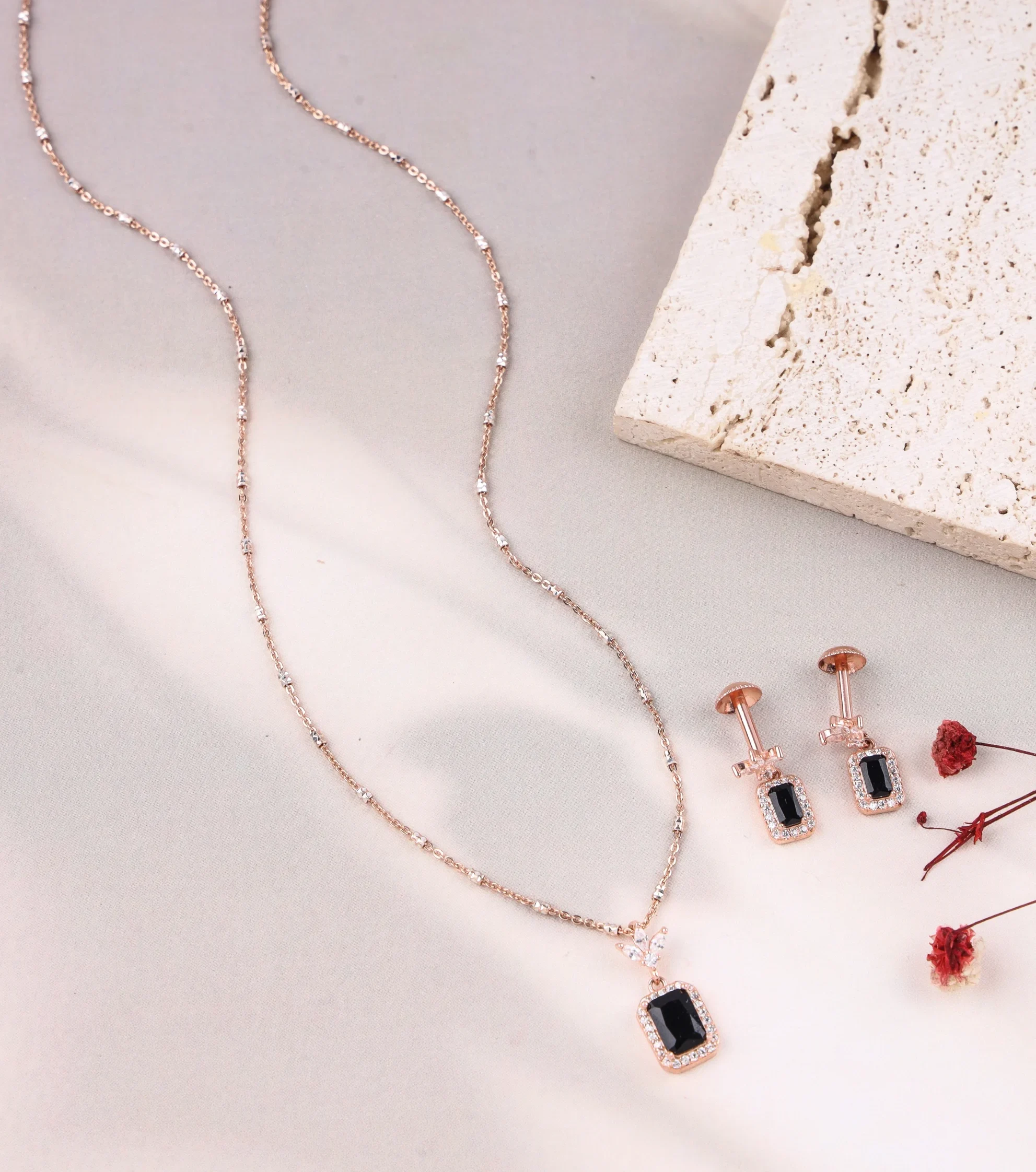 Add a vibrant touch of color with our onyx black Dainty Set. Crafted from high-quality 925 sterling silver with a radiant rose gold plating, this set features a necklace and matching stud earrings. The necklace showcases a stunning, black rectangular stone suspended from a delicate two-tone chain. The earrings mirror this design, with a brilliant-cut clear stone above the matching rectangular stone, creating a captivating drop effect. This elegant and contemporary set is perfect for making a sophisticated statement. The necklace chain is 18 inches with a 2-inch extension, allowing for an adjustable fit.