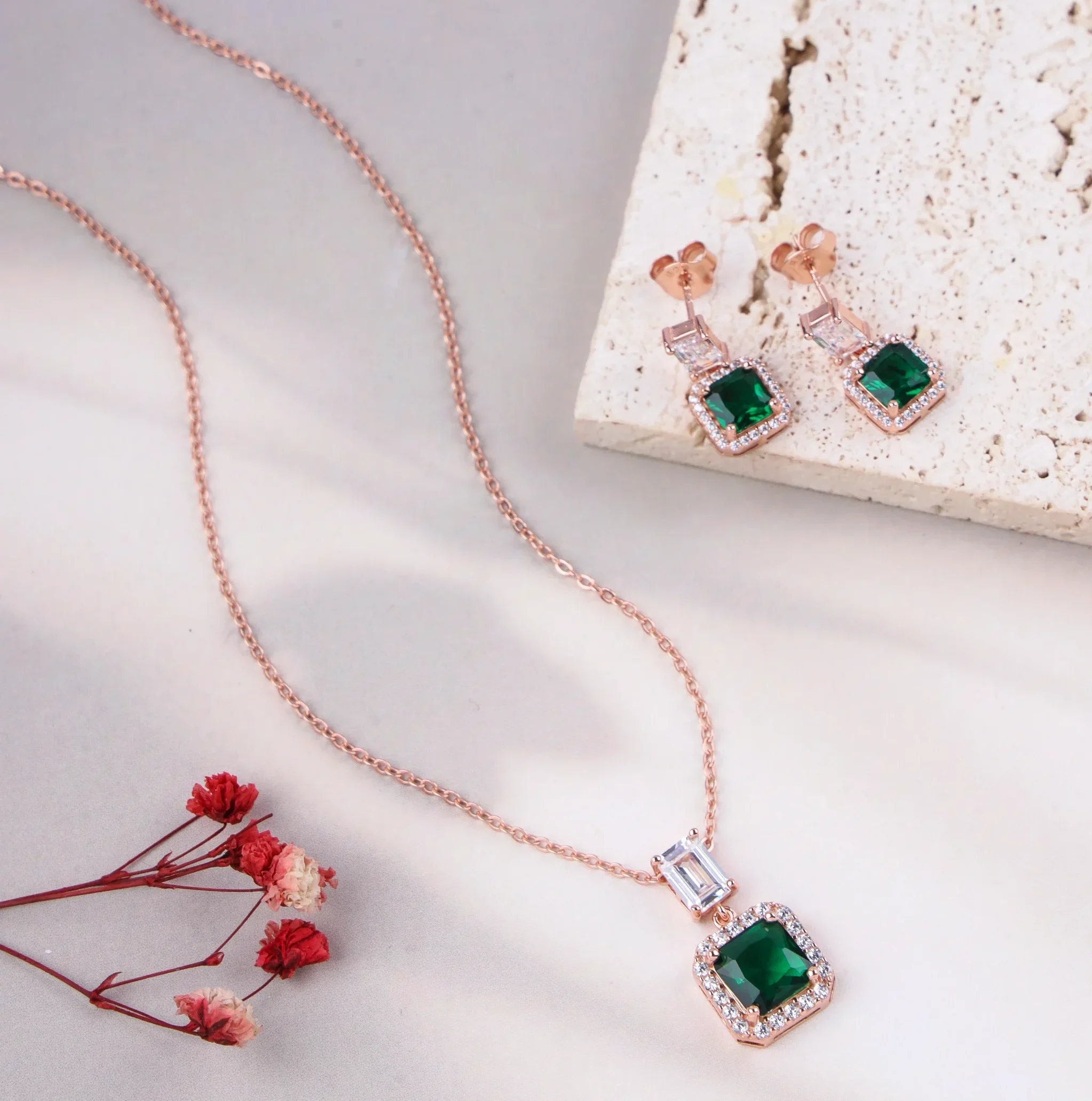 Make a bold statement with our Emerald Cushion Cut Halo Set. This stunning necklace and earring set is crafted from high-quality 925 sterling silver and features a luxurious rose gold plating. The necklace showcases a brilliant cushion-cut emerald-colored stone, beautifully framed by a halo of smaller pavé-set stones. This design maximizes the sparkle and color of the central gem. The matching drop earrings feature a smaller, coordinating cushion-cut stone with a similar halo effect. This set is a sophisticated choice for adding a pop of vibrant color to any ensemble. The necklace chain is 18 inches with a 2-inch extension, allowing for an adjustable fit.