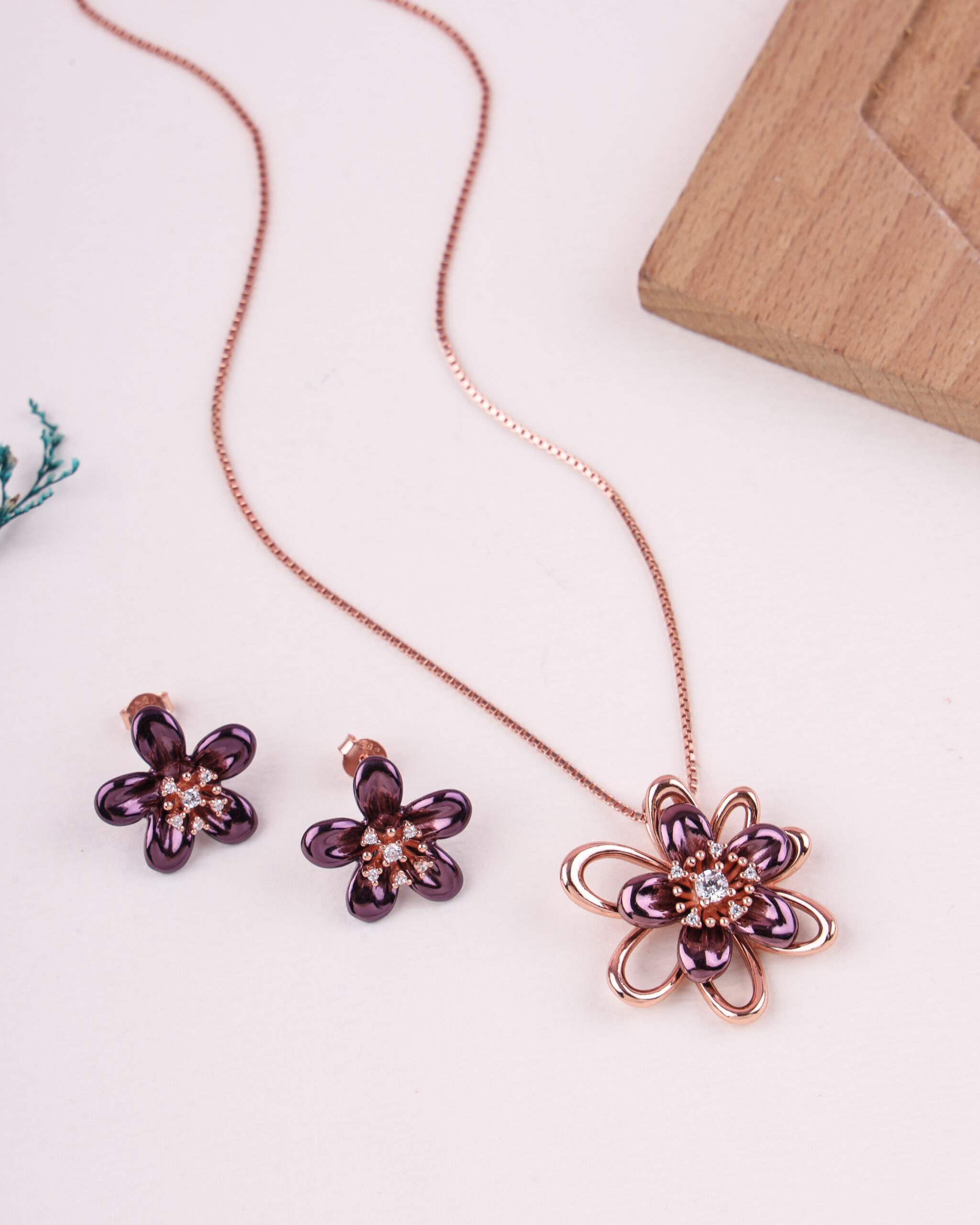 Capturing the mystery of a garden at twilight, this set features a striking deep-purple floral motif. The pendant and matching earrings are designed to evoke the velvet petals of a rare orchid blooming under a moonlit sky. It is a bold, artistic statement for the woman who finds beauty in the shadows and elegance in the unusual.