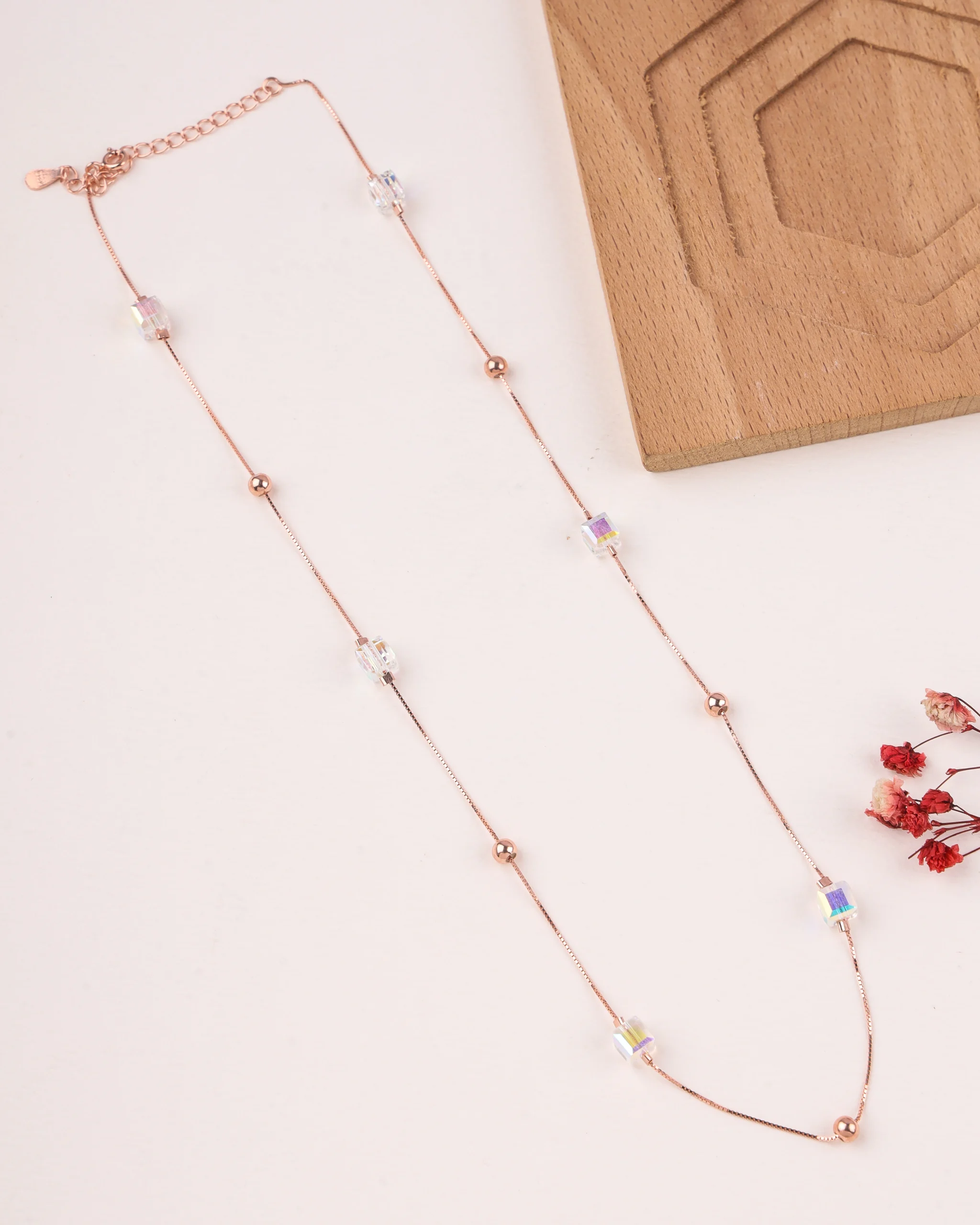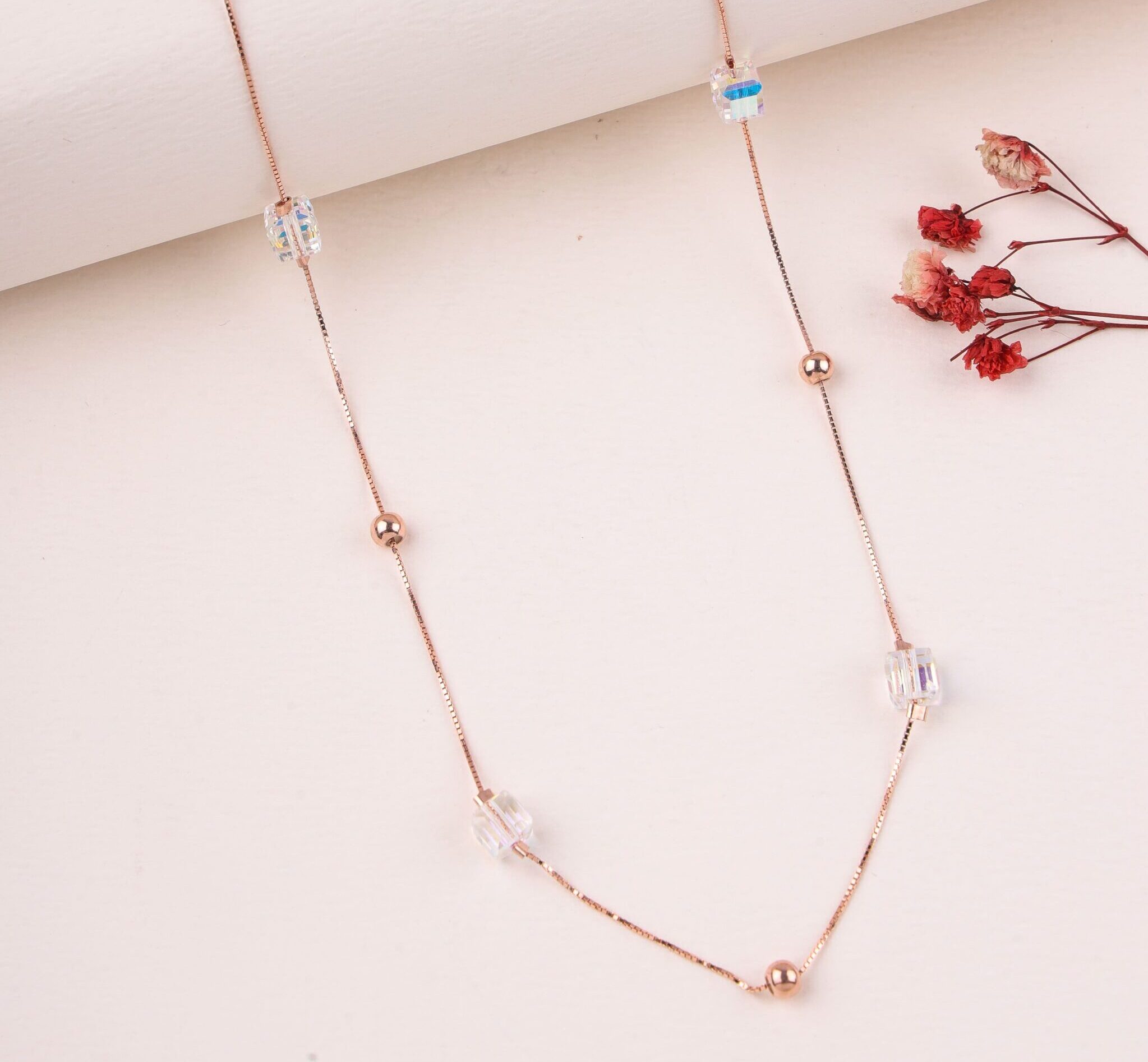 A captivating 925 silver necklace with a rose gold plating, featuring a delicate chain adorned with polished beads and rectangular cubic zirconia crystals that shimmer with an iridescent Aurora Borealis effect. The spaced-out design is perfect for a modern, layered look.