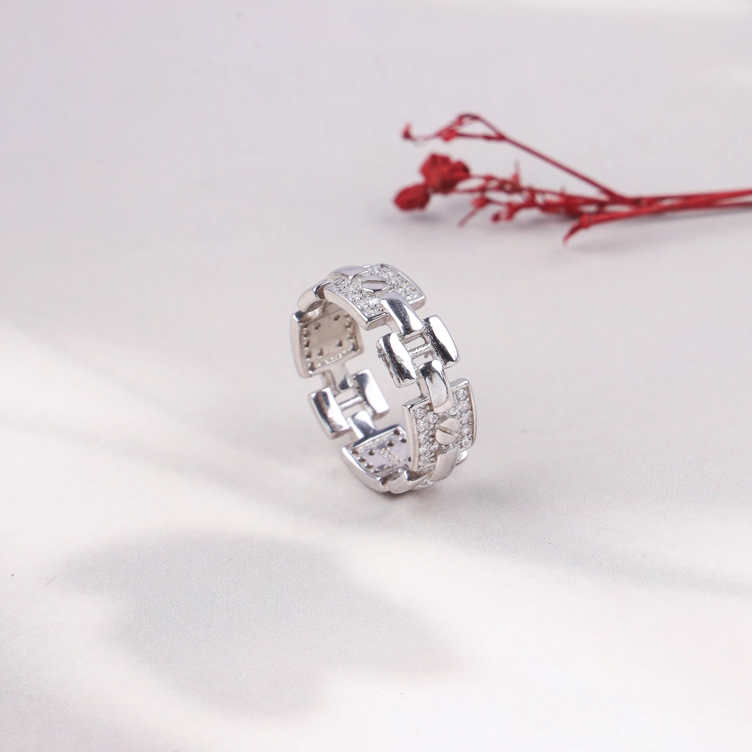 A highly premium 925 silver statement ring with a series of rectangular, linked segments. Each segment is adorned with small pave-set stones, giving the ring a brilliant, diamond-like sparkle. The design resembles a watch band, offering a bold and fashionable aesthetic.