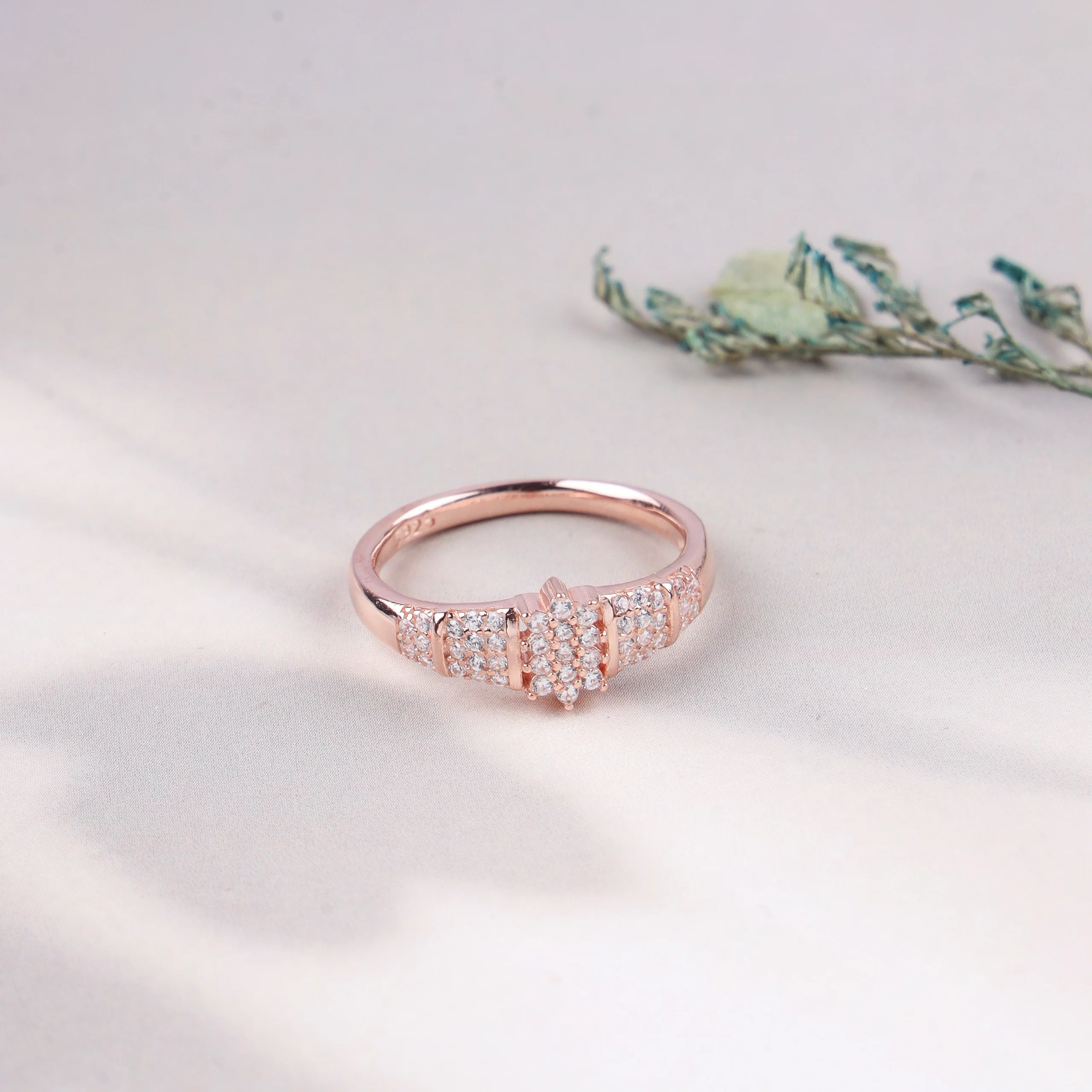 This elegant and modern ring captures the look of a shimmering celestial body. Crafted from 925 sterling silver with a luxurious rose gold plating, it features a central cluster of three sparkling baguette-cut cubic zirconia, flanked by two rows of pavé-set cubic zirconia. The design expands outward from the center, creating a stunning fan-like effect that is both delicate and eye-catching.