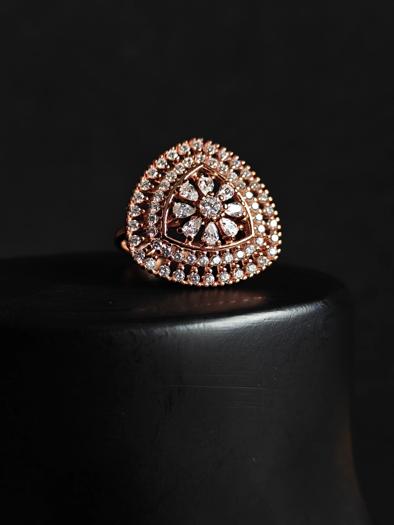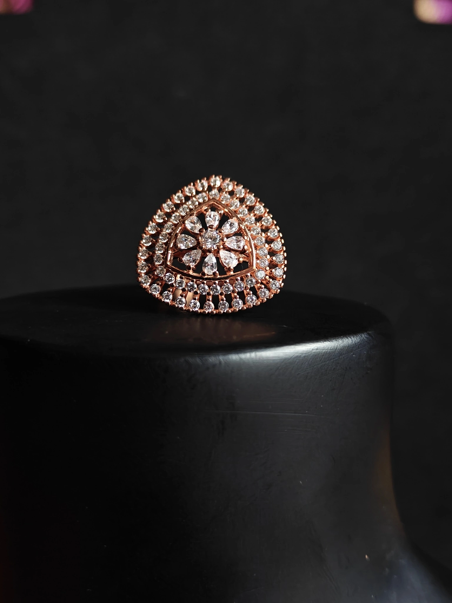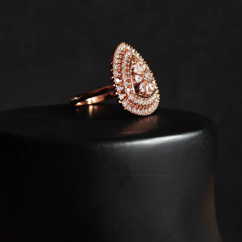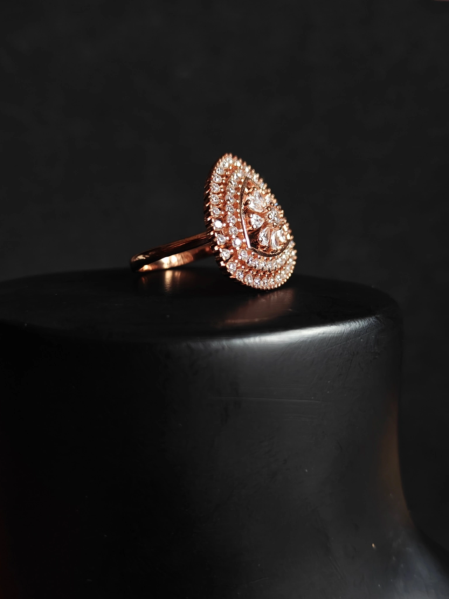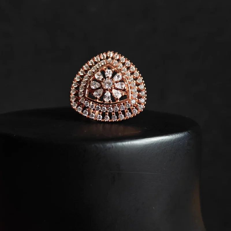 Crafted from a durable 925 sterling silver base and finished with a romantic rose gold plating, this piece offers a luxurious look without compromising on comfort. It is completely nickel-free and hypoallergenic, making it perfect for sensitive skin during long events. Whether paired with ethnic sarees and lehengas or a modern gown, this cocktail ring is the ultimate accessory for making a grand entrance.