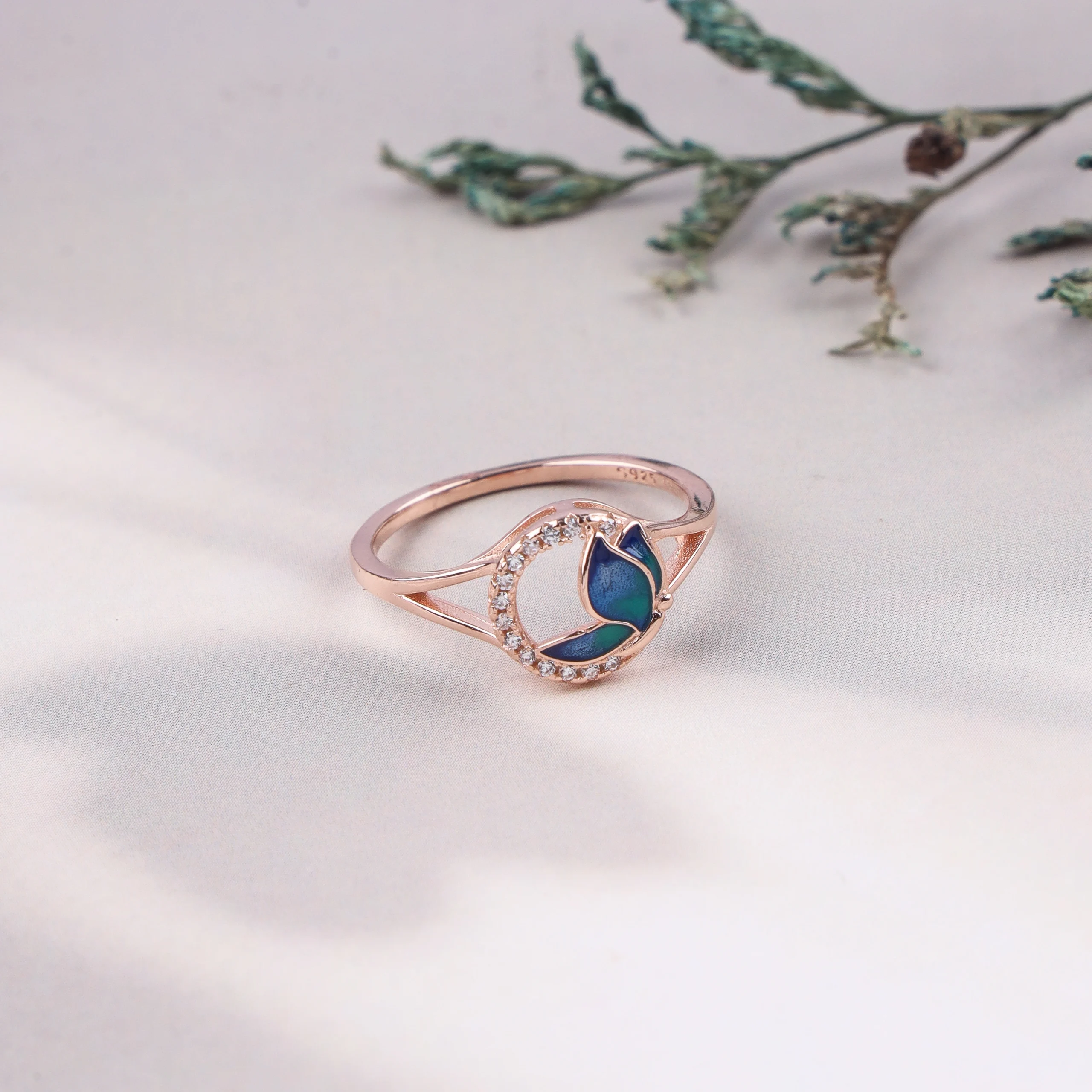 Embrace the beauty of nature with this exquisite ring. Crafted from 925 sterling silver with a delicate rose gold plating, it features a captivating butterfly design with vibrant blue and green enamel wings. The butterfly is gracefully enclosed within a shimmering halo of pavé-set cubic zirconia, creating a look that is both whimsical and elegant.