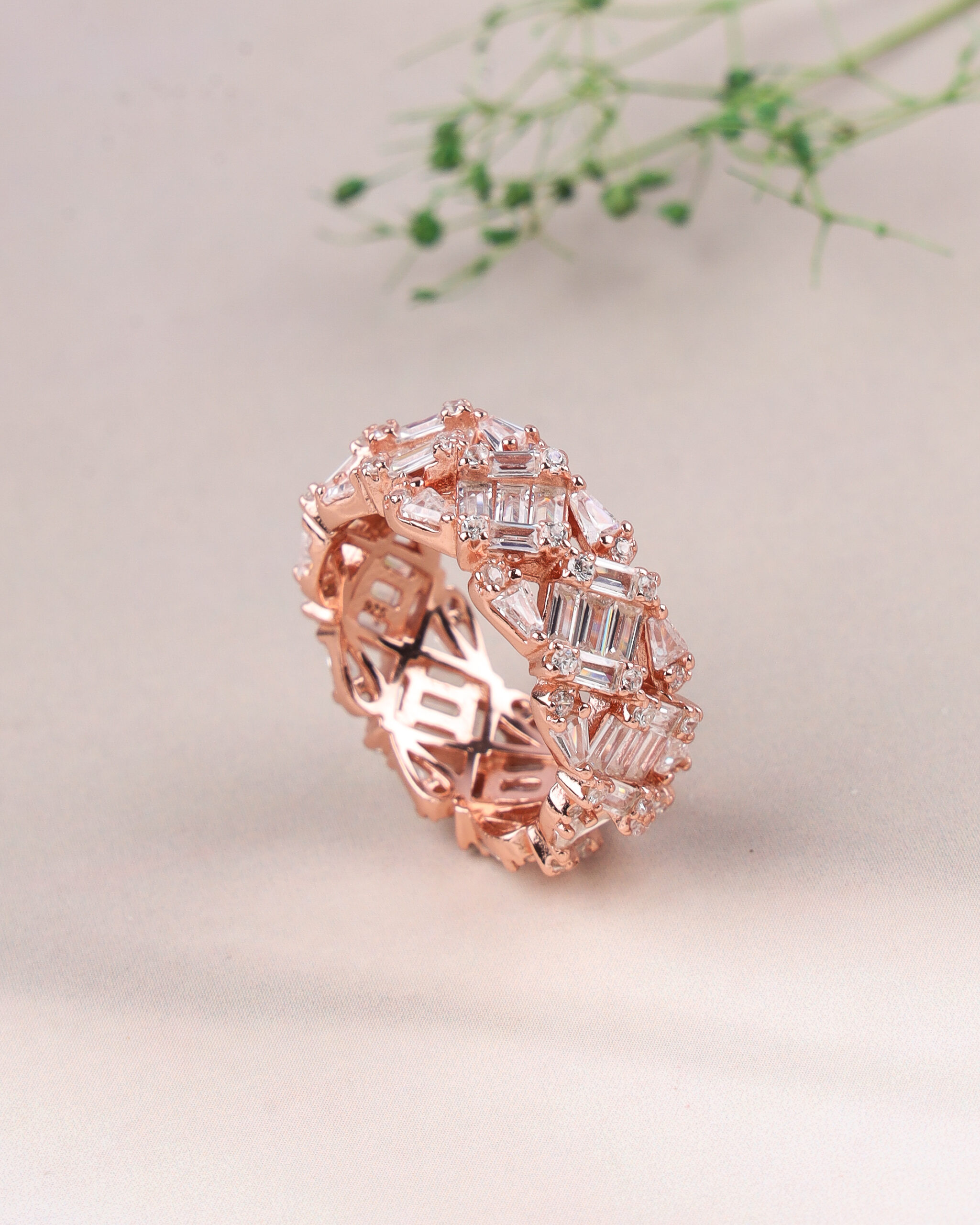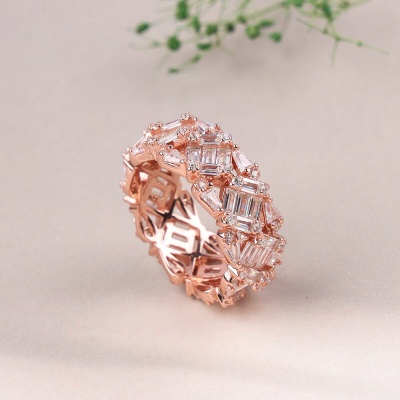This bold and beautiful eternity ring is a celebration of texture and color. Made from 925 sterling silver with a warm rose gold plating, it is fully encircled with a repeating pattern of baguette-cut American Diamonds and sparkling pavé-set white cubic zirconia. The unique zigzagging edge of the band adds an extra layer of contemporary style.