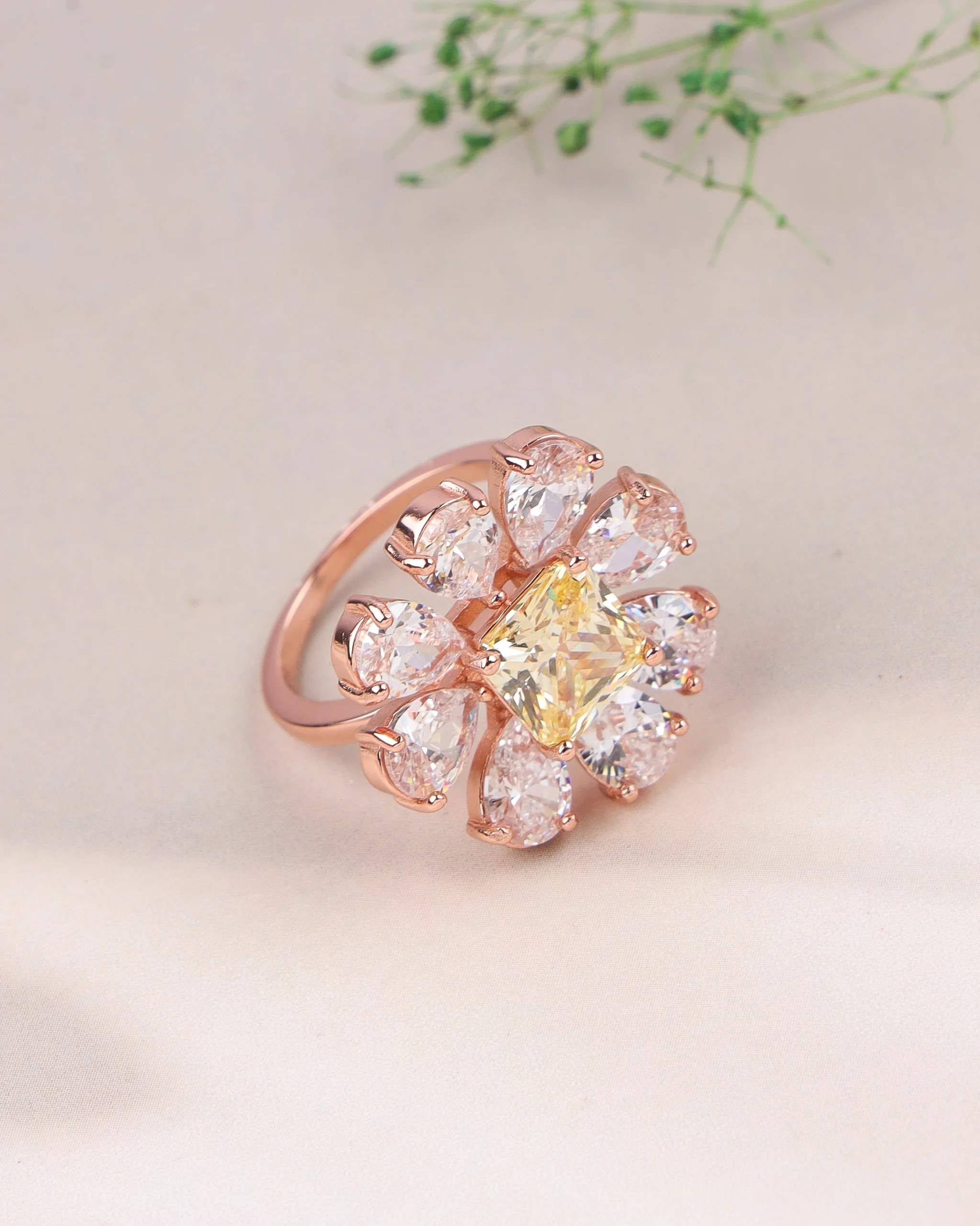 Radiate joy with this gorgeous floral-inspired ring. A brilliant, square-cut yellow cubic zirconia sits at the center, surrounded by a halo of eight sparkling pear-shaped cubic zirconia that resemble delicate petals. The ring is crafted from 925 sterling silver with a warm rose gold plating, creating a beautiful contrast and a truly stunning piece.