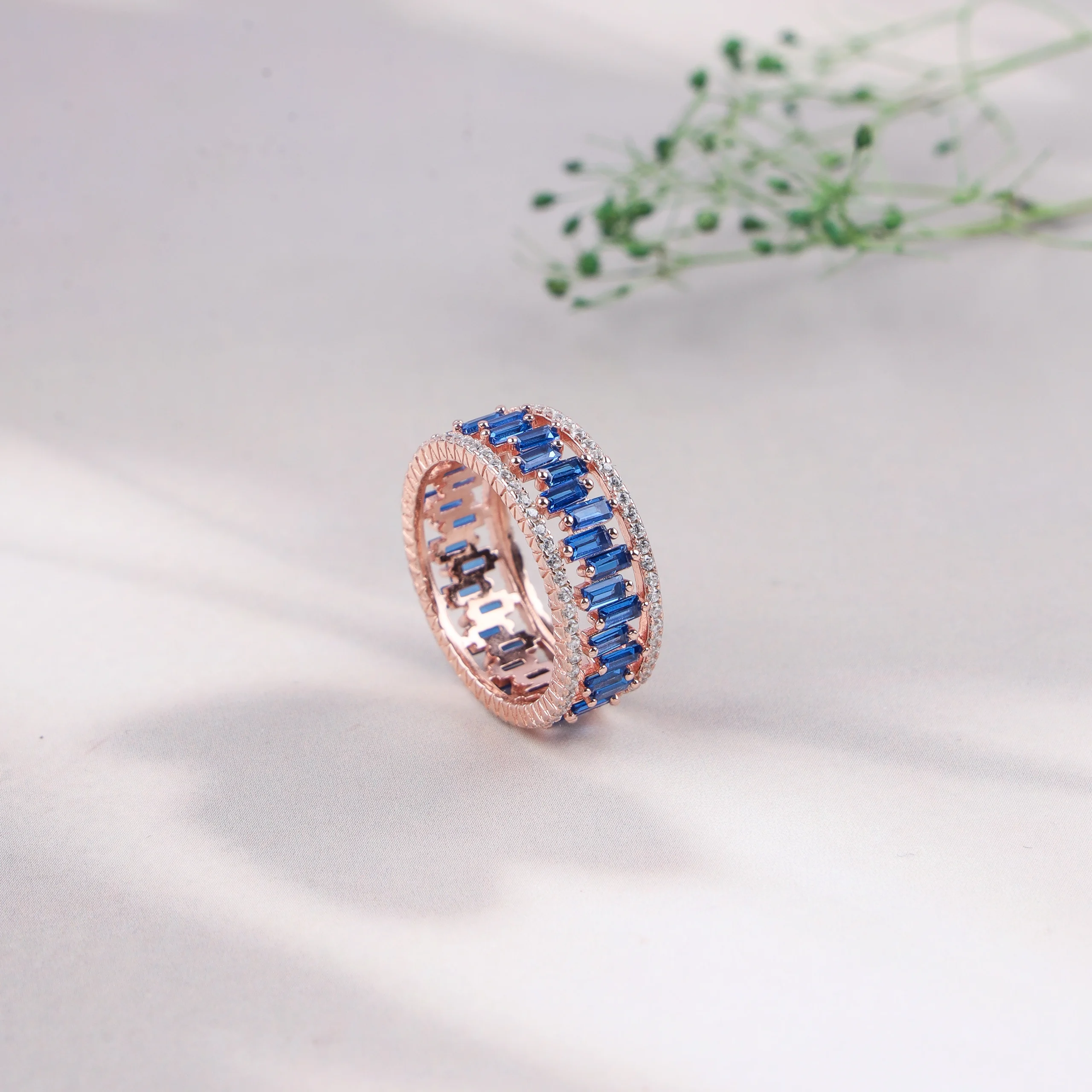This striking band combines classic elegance with modern flair. Crafted from 925 sterling silver with a luxurious rose gold finish, it features a central row of high-quality, imported deep blue baguette-cut stones, flanked by a delicate row of clear, round stones. The intricate rope-like texture on the edges adds a unique and beautiful touch, meticulously crafted to international quality standards.