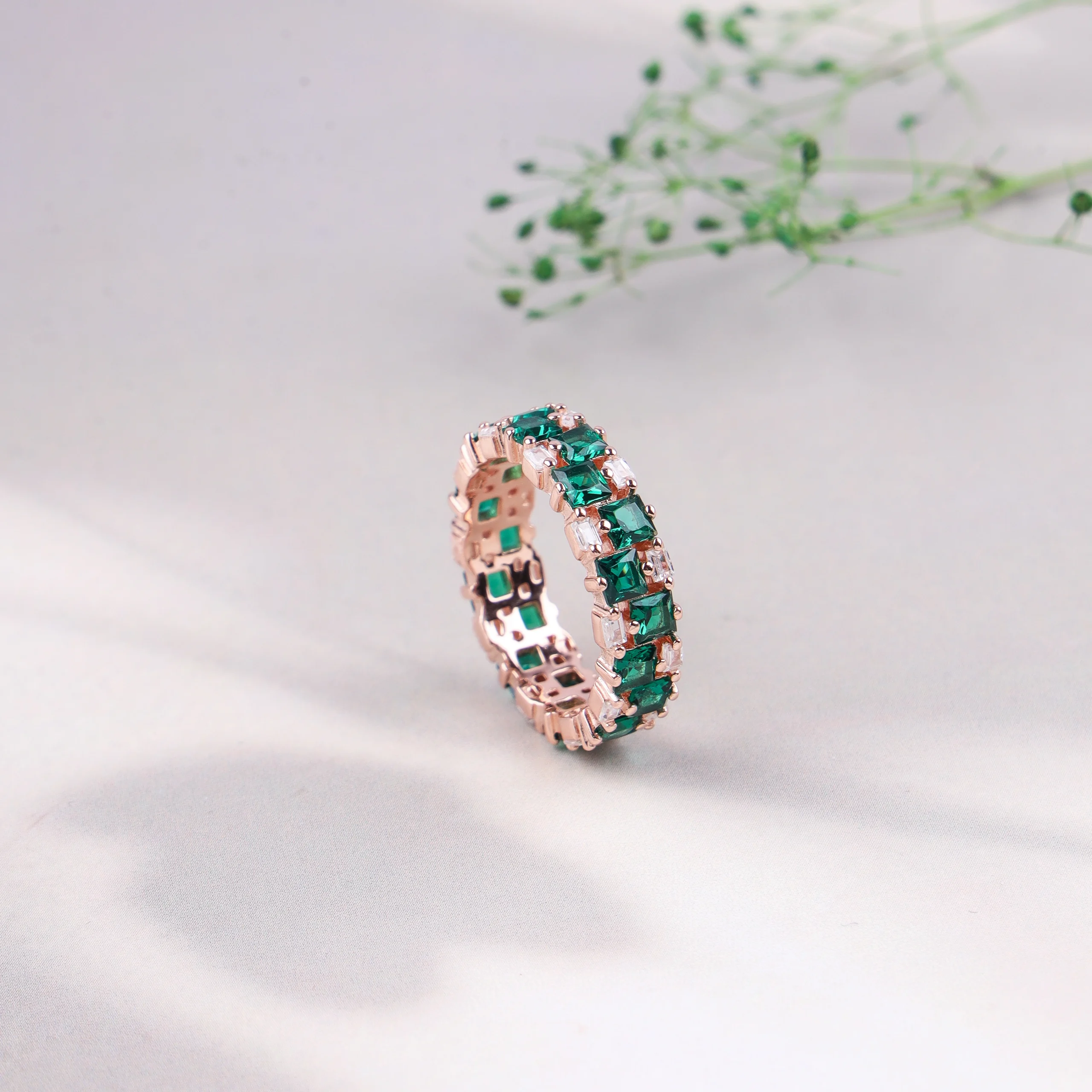 : A classic and sophisticated eternity band, crafted from 925 sterling silver with a luxurious rose gold plating. This ring showcases a striking pattern of alternating high-quality, imported green emerald-cut stones and clear baguette stones. Meticulously crafted to international quality standards, this piece is a perfect blend of timeless design and modern elegance.