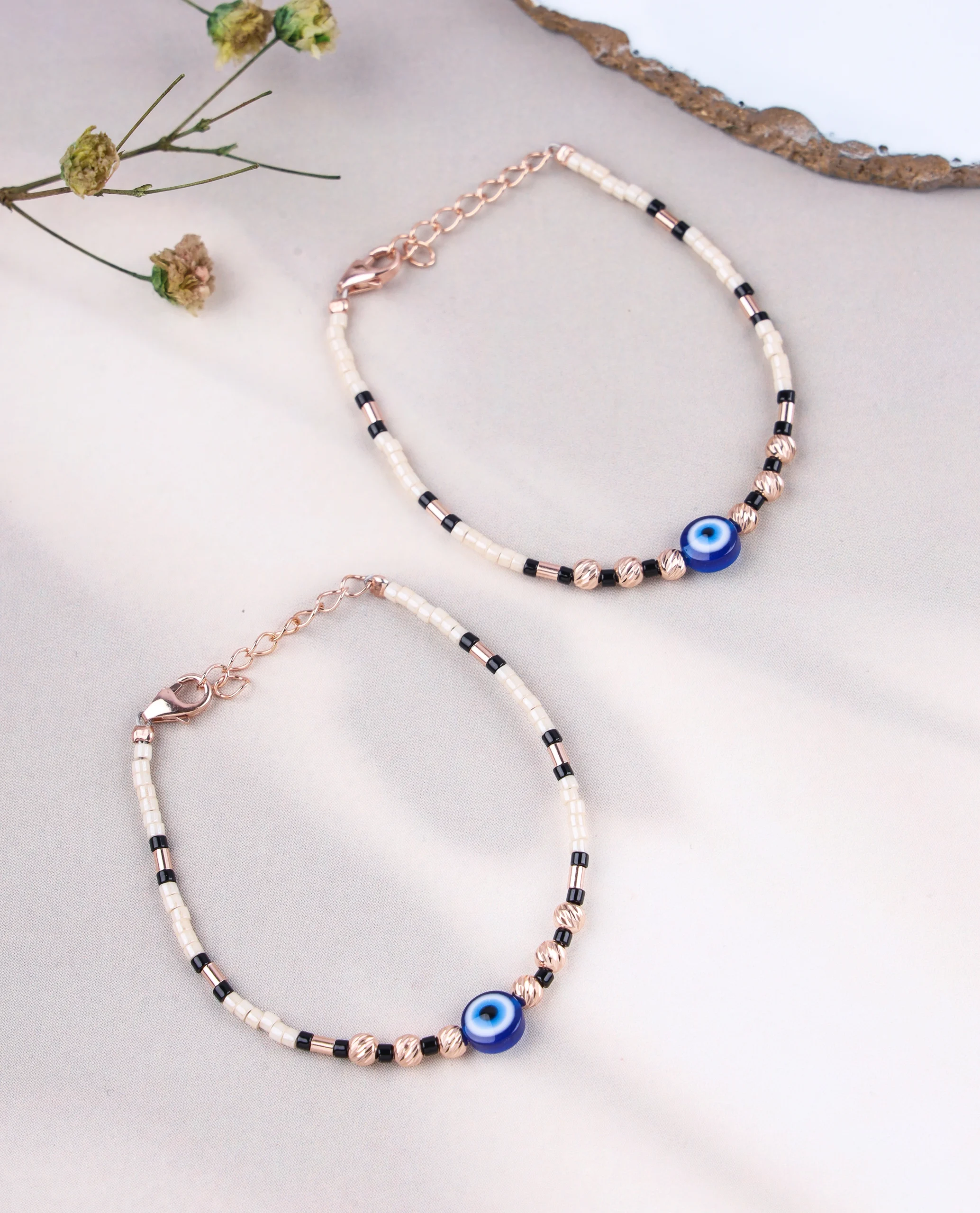 “Offer gentle protection to your little one with our Innocent Gaze Evil Eye Baby Bracelet, thoughtfully designed for ages 0-3 years. This delicate bracelet features a charming mix of soft white and black beads, complemented by shimmering rose gold-toned accents. At its heart lies a vibrant blue ‘evil eye’ bead, a traditional symbol believed to ward off negative influences and bring good fortune. Crafted for comfort and peace of mind, it includes adjustable links to ensure a snug and secure fit as your baby grows. A beautiful and meaningful token for your precious child.”